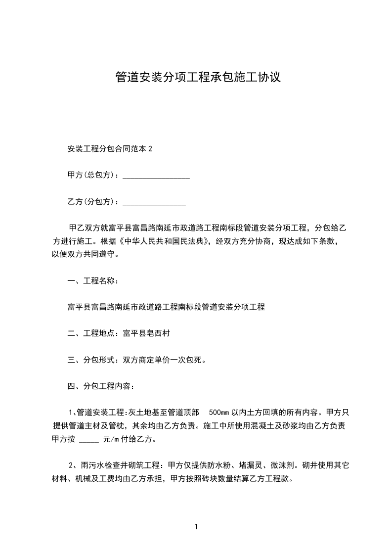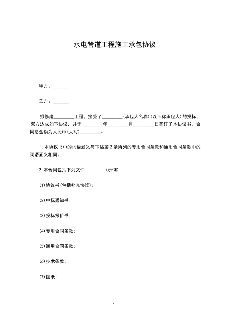 甲乙双方经过友好协商,就乙方承包甲方所有的管道施工事宜达成一致,签订本合同。