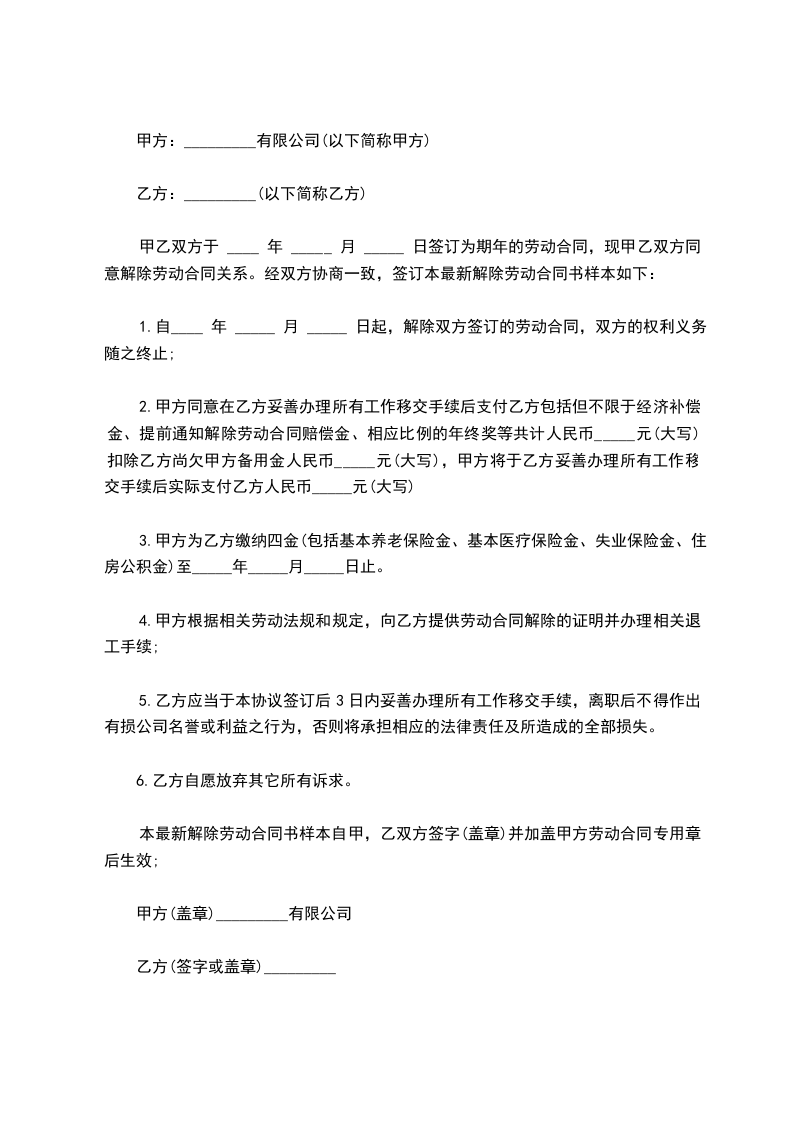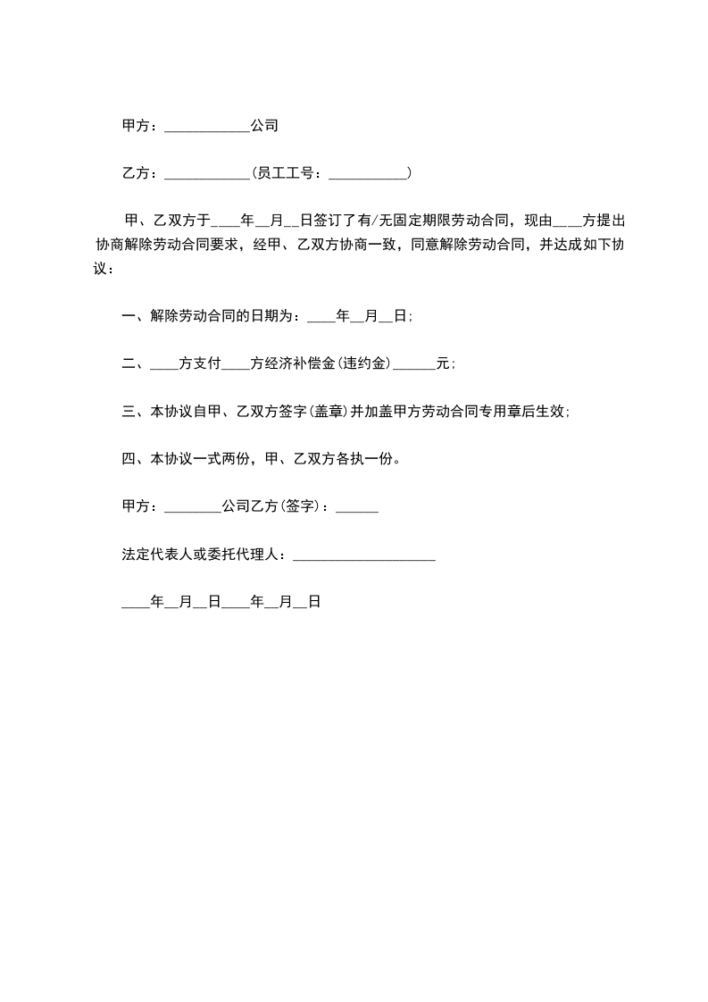 一、经甲、乙双方当事人协商一致,从__________年__________月__________日起解除双方的劳动关系。