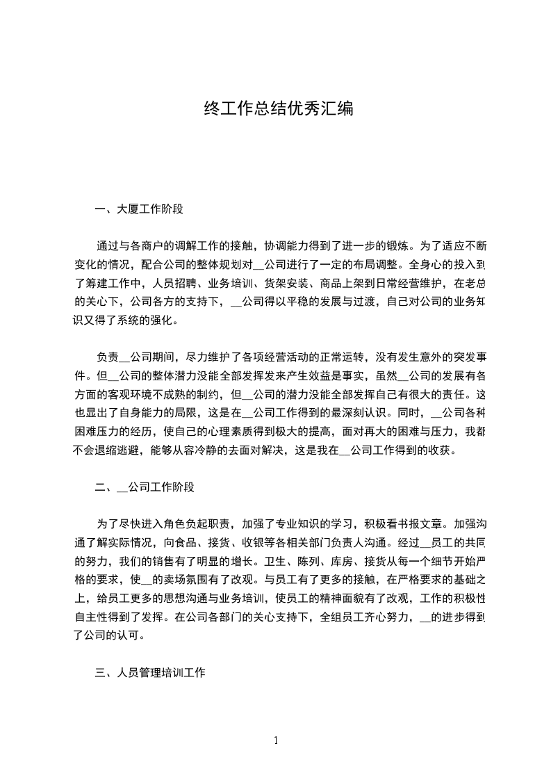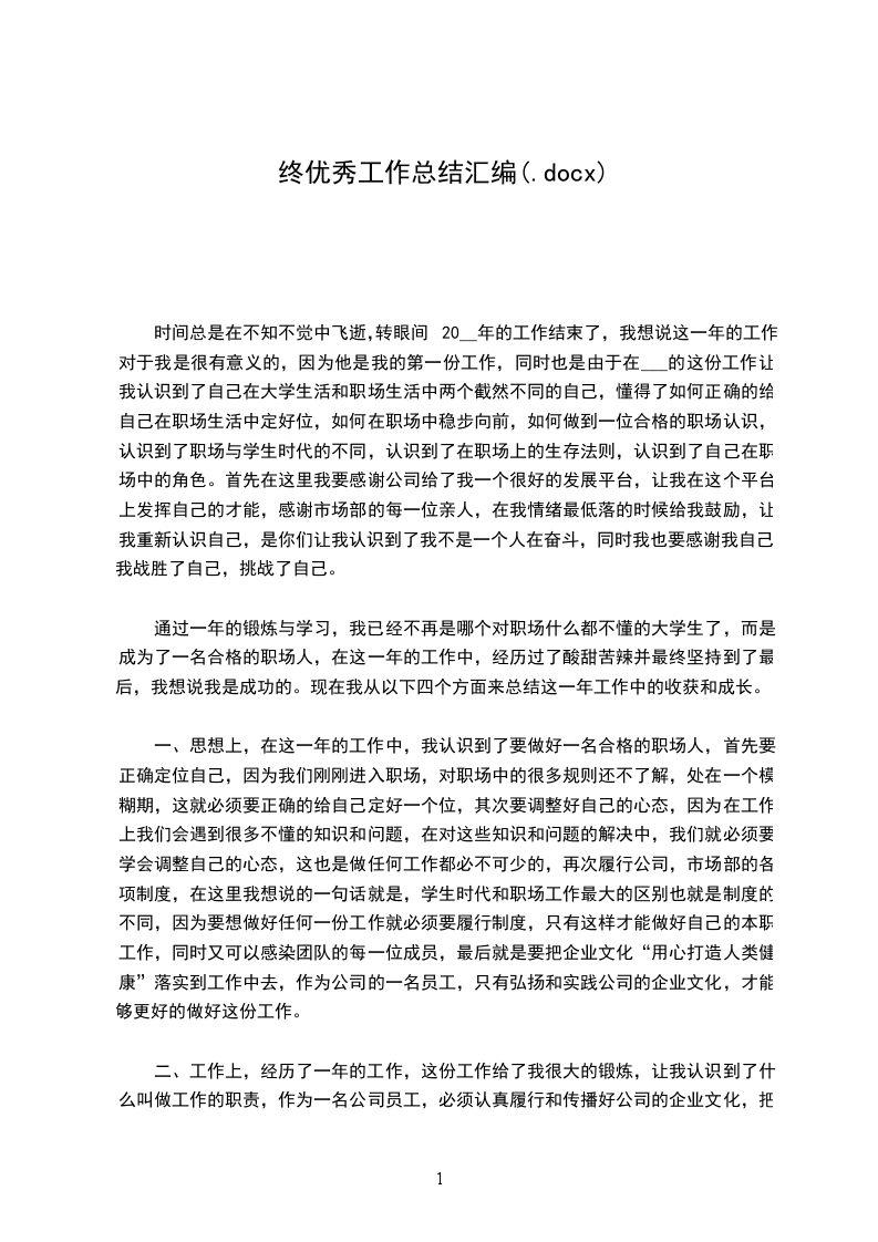 时间总是在不知不觉中飞逝,转眼间20__年的工作结束了,我想说这一年的工作对于我是很有意义的,因为他是我的第一份工作,同时也是由于在___的这份工作让我认识到了自己在大学生活和职场生活中两个截然不同的自己,懂得了如何正确的给自己在职场生活中定好位,如何在职场中稳步向前,如何做到一位合格的职场认识,认识到了职场与学生时代的不同,认识到了在职场上的生存法则,认识到了自己在职场中的角色。首先在这里我要感谢公司给了我一个很好的发展平台,让我在这个平台上发挥自己的才能,感谢市场部的每一位亲人,在我情绪最低落的时候给我鼓励,让我重新认识自己,是你们让我认识到了我不是一个人在奋斗,同时我也要感谢我自己,我战胜了自己,挑战了自己。