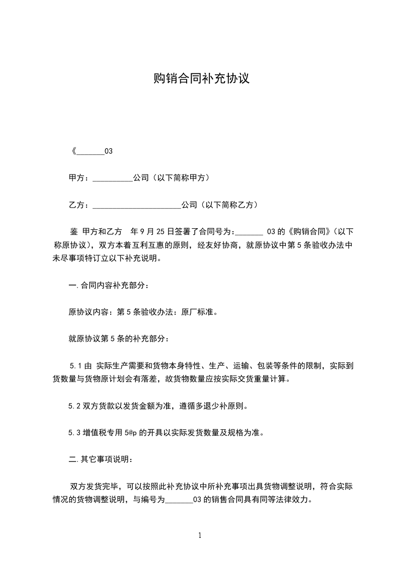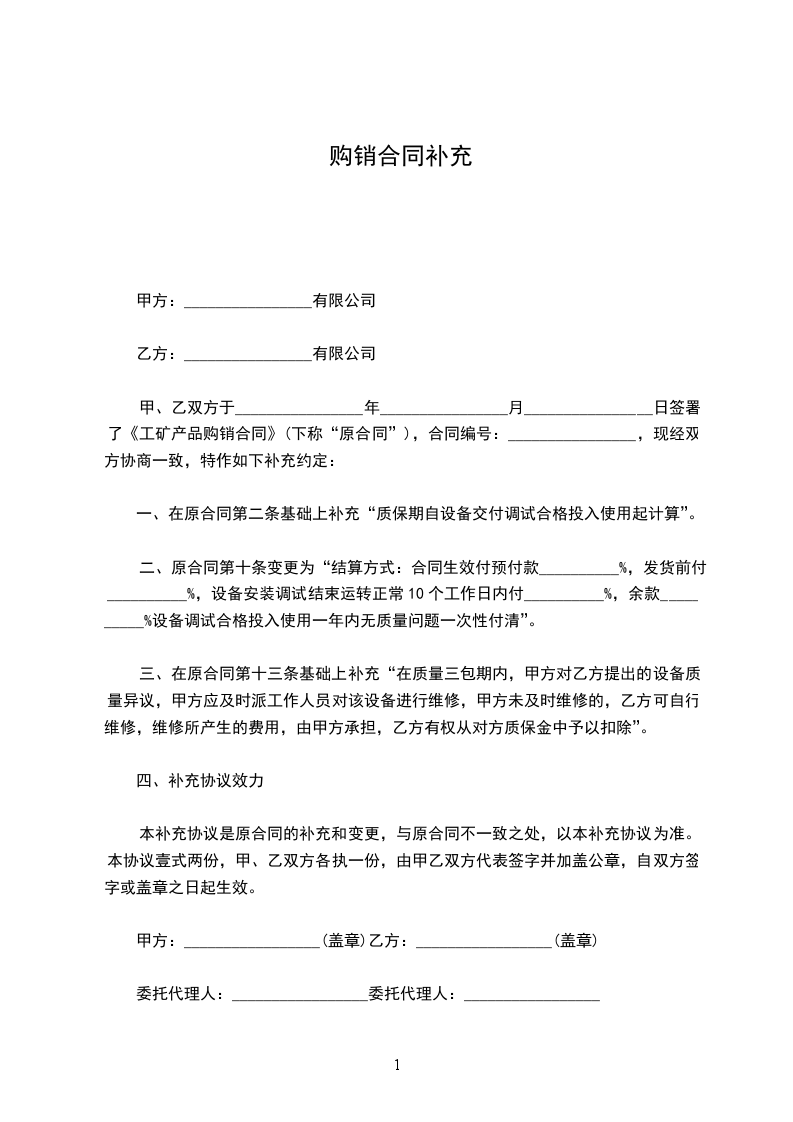 甲、乙双方于________________年________________月________________日签署了《工矿产品购销合同》(下称“原合同”),合同编号:________________,现经双方协商一致,特作如下补充约定: