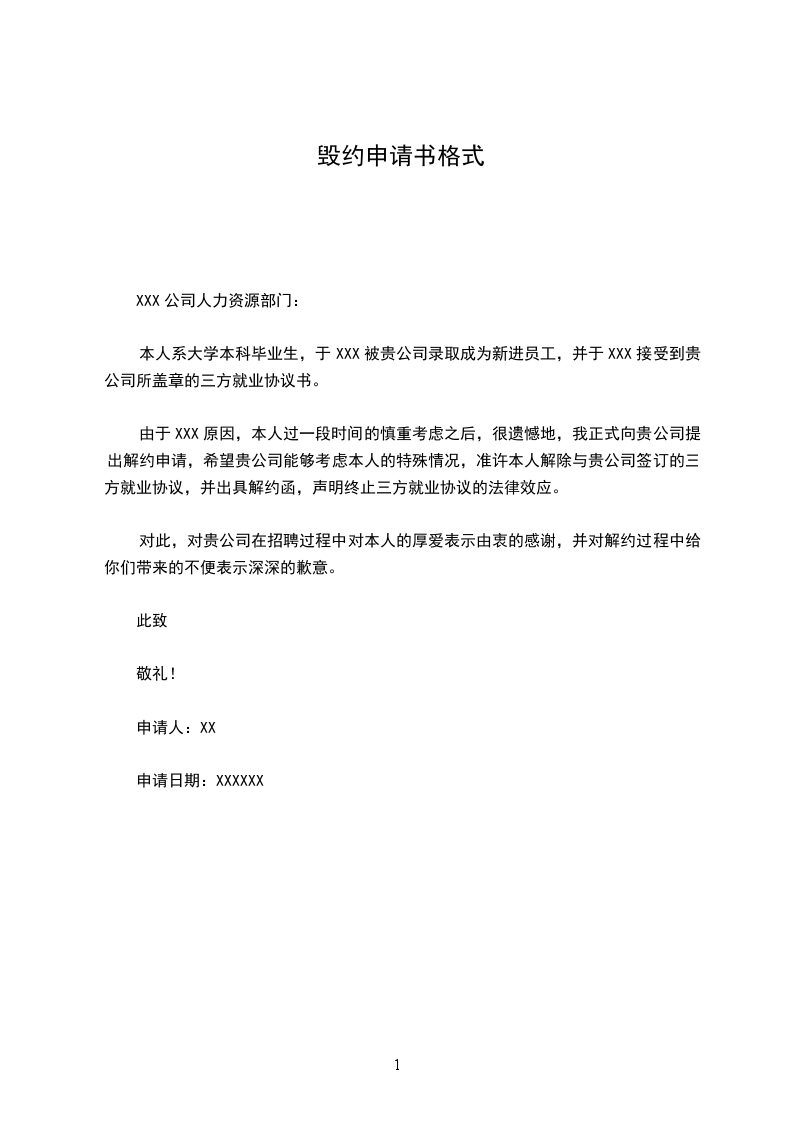 由于XXX原因,本人过一段时间的慎重考虑之后,很遗憾地,我正式向贵公司提出解约申请,希望贵公司能够考虑本人的特殊情况,准许本人解除与贵公司签订的三方就业协议,并出具解约函,声明终止三方就业协议的法律效应。