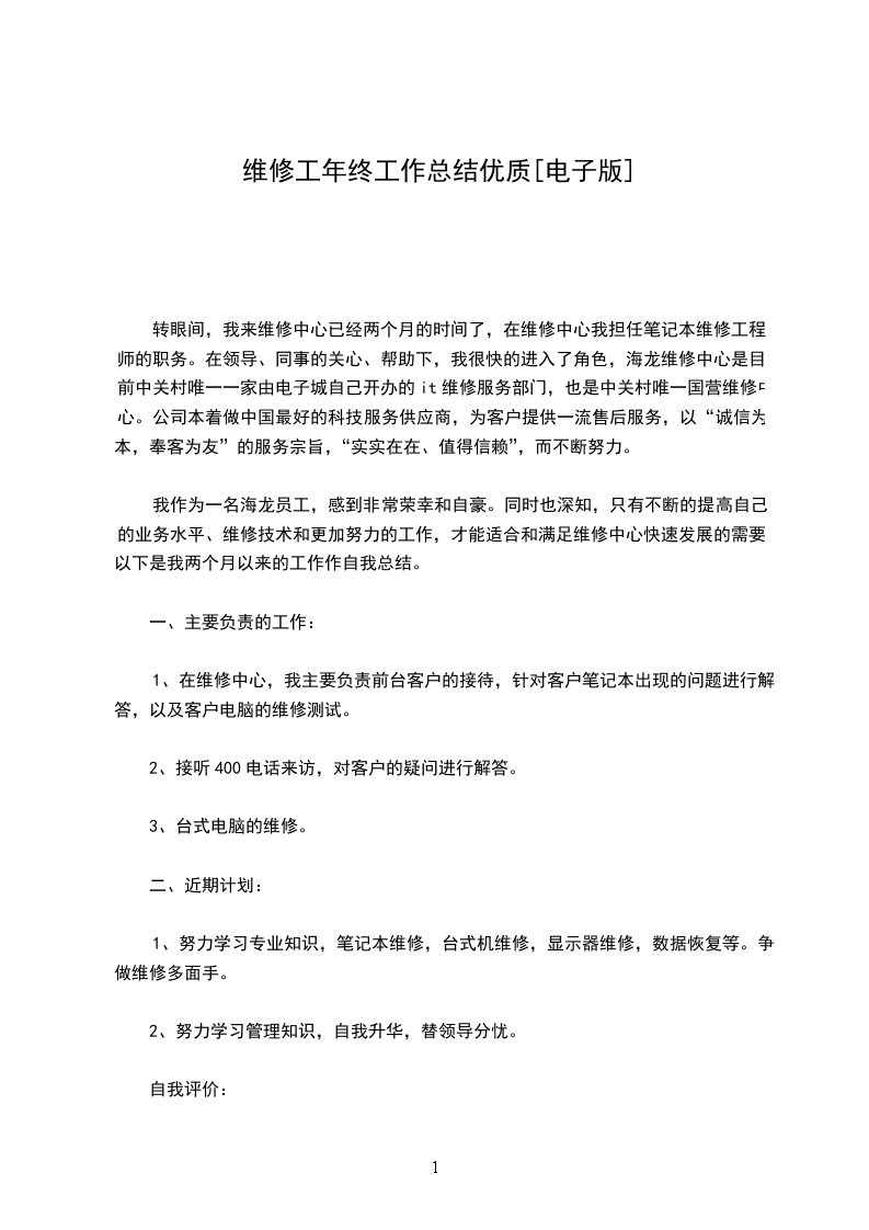 我作为一名海龙员工,感到非常荣幸和自豪。同时也深知,只有不断的提高自己的业务水平、维修技术和更加努力的工作,才能适合和满足维修中心快速发展的需要。以下是我两个月以来的工作作自我总结。
