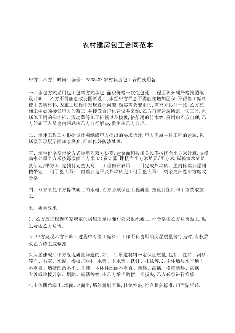 其它未尽事宜,双方协商解决,按国家以及本地标准从严执行。承包方式包工不包料,甲方负责采购施工所需的建筑材料,乙方负责施工,并负责所有施工本合同一式二份,甲乙双方各执一份,从签字之日起生效。