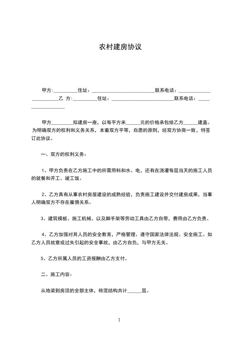 甲方在建房屋一栋,由乙方承包施工。为明确双方权利义务关系,经平等协商,双方自愿签订本合同。