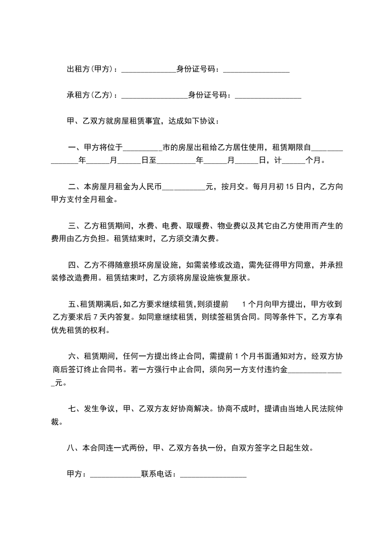 双方就乙方租赁甲方房屋一事,经协商达成如下协议: