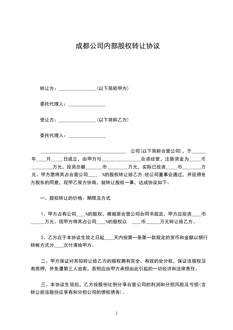 ____________________________________ 公司(以下简称合营公司),于______年____月_____日成立,由甲方与________________合资经营,注册资金为_____币 _________万元,投资总额_______币_________万元,实际已投资_____币________万元。甲方愿将其占合营公司____ %的股权转让给乙方;经公司董事会通过,并征得他方股东的同意,现甲乙双方协商,就转让股权一事,达成协议如下: