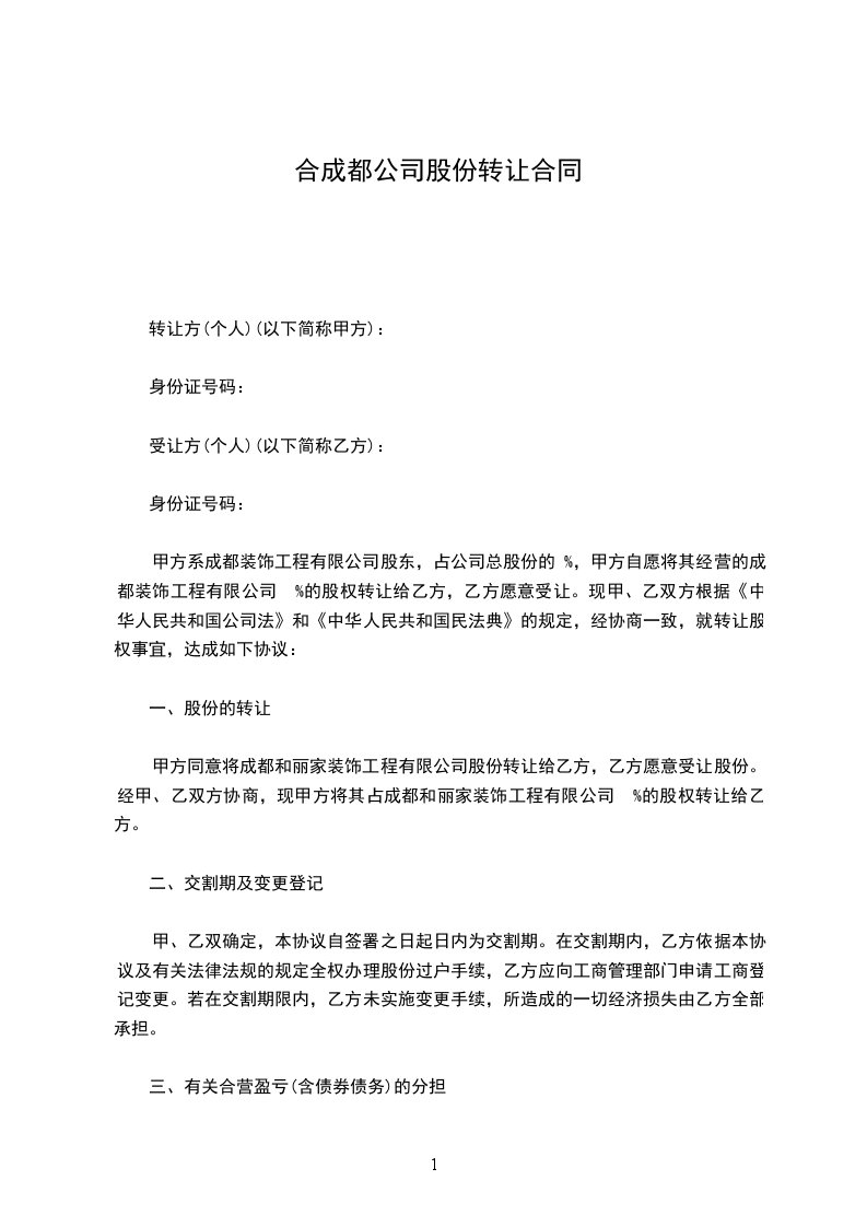 1、甲方占有公司____%的股权,根据原合营公司合同书规定,甲方应投资____币______万元。现甲方将其占公司____%的股权以 ____币______万元转让给乙方。