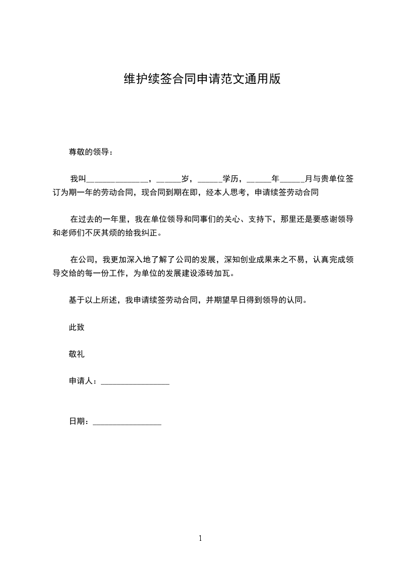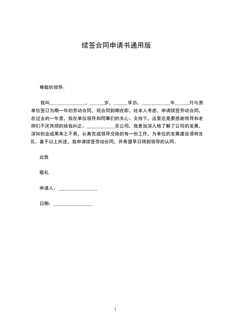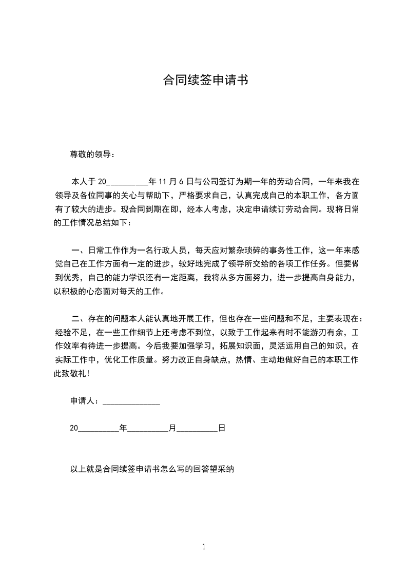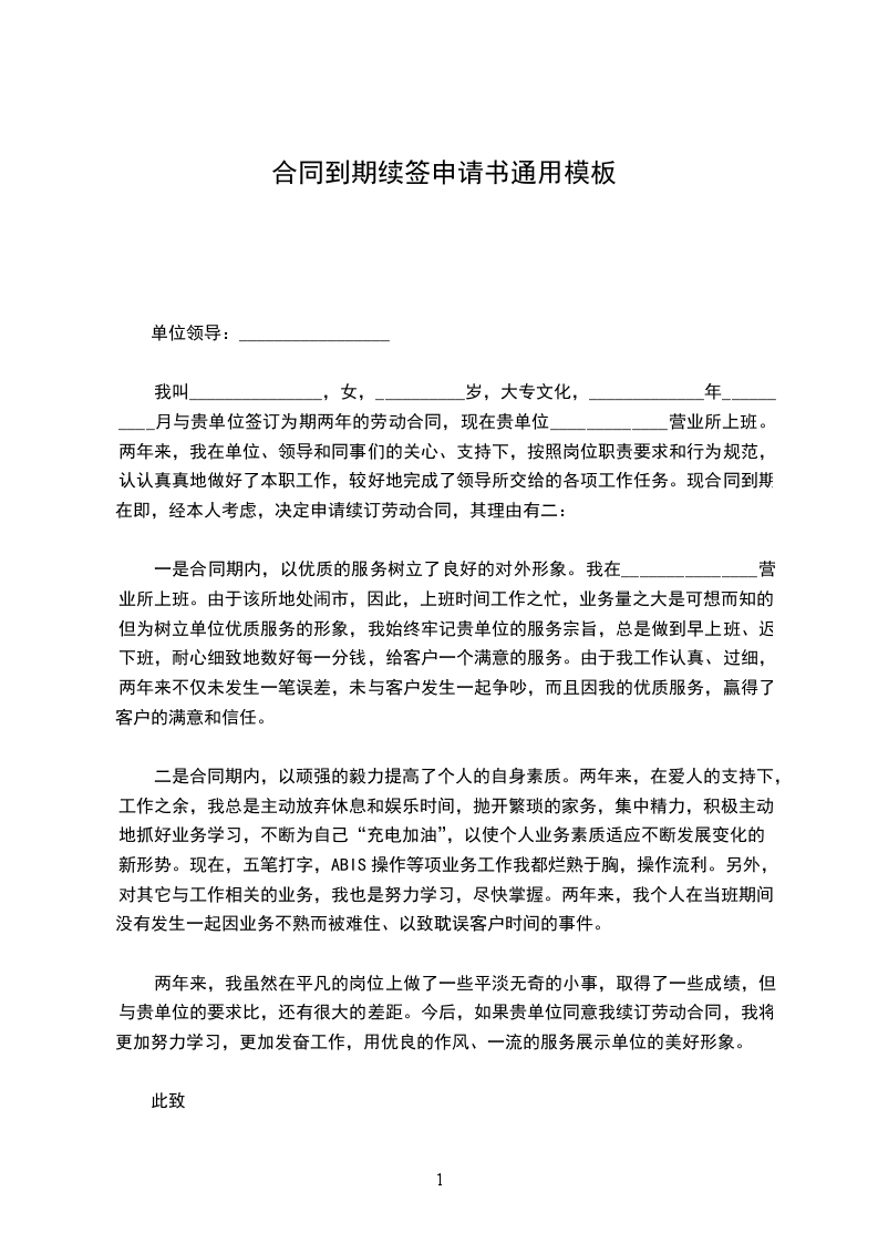 我叫_______________,女,__________岁,大专文化,_____________年__________月与贵单位签订为期两年的劳动合同,现在贵单位_____________营业所上班。两年来,我在单位、领导和同事们的关心、支持下,按照岗位职责要求和行为规范,认认真真地做好了本职工作,较好地完成了领导所交给的各项工作任务。现合同到期在即,经本人考虑,决定申请续订劳动合同,其理由有二:一是合同期内,以优质的服务树立了良好的对外形象。我在_______________营业所上班。由于该所地处闹市,因此,上班时间工作之忙,业务量之大是可想而知的。但为树立单位优质服务的形象,我始终牢记贵单位的服务宗旨,总是做到早上班、迟下班,耐心细致地数好每一分钱,给客户一个满意的服务。由于我工作认真、过细,两年来不仅未发生一笔误差,未与客户发生一起争吵,而且因我的优质服务,赢得了客户的满意和信任。二是合同期内,以顽强的毅力提高了个人的自身素质。两年来,在爱人的支持下,工作之余,我总是主动放弃休息和娱乐时间,抛开繁琐的家务,集中精力,积极主动地抓好业务学习,不断为自己“充电加油”,以使个人业务素质适应不断发展变化的新形势。现在,五笔打字,ABIS操作等项业务工作我都烂熟于胸,操作流利。另外,对其它与工作相关的业务,我也是努力学习,尽快掌握。两年来,我个人在当班期间,没有发生一起因业务不熟而被难住、以致耽误客户时间的事件。两年来,我虽然在平凡的岗位上做了一些平淡无奇的小事,取得了一些成绩,但与贵单位的要求比,还有很大的差距。今后,如果贵单位同意我续订劳动合同,我将更加努力学习,更加发奋工作,用优良的作风、一流的服务展示单位的美好形象。此致敬礼