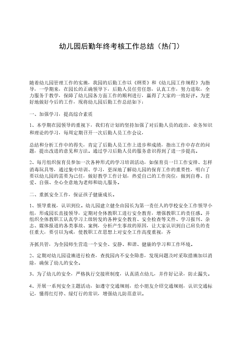 随着幼儿园管理工作的实施,我园的后勤工作以《纲要》和《幼儿园工作规程》为指导,一学期来,在园长的正确领导下,后勤人员任劳任怨,认真工作,努力进取,全力服务于教学,保障了幼儿园各方面工作的顺利进行,赢得了大家的一致好评。为更好地做好今后的工作,现将幼儿园后勤工作总结如下: