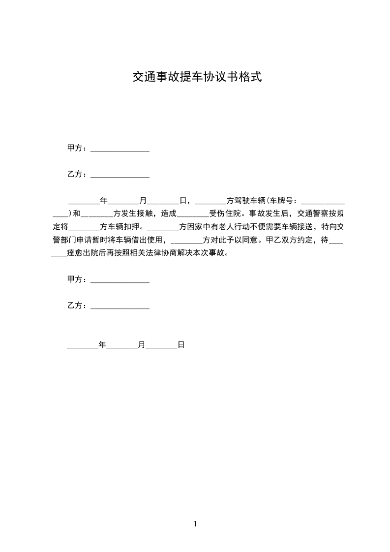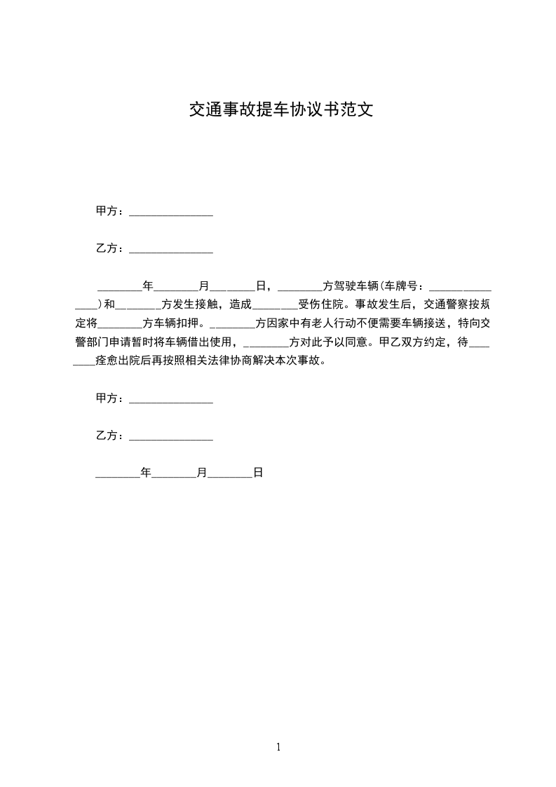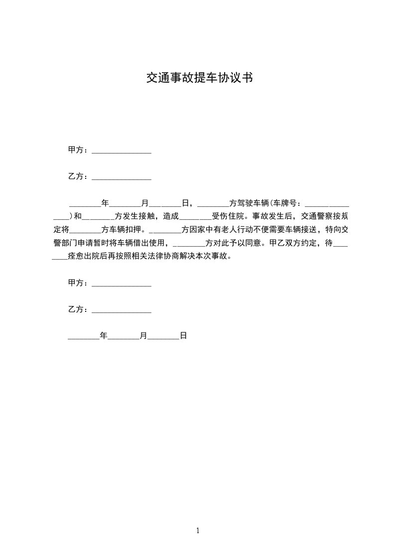 ________年________月________日,________方驾驶车辆(车牌号:_______________)和________方发生接触,造成________受伤住院。事故发生后,交通警察按规定将________方车辆扣押。________方因家中有老人行动不便需要车辆接送,特向交警部门申请暂时将车辆借出使用,________方对此予以同意。甲乙双方约定,待________痊愈出院后再按照相关法律协商解决本次事故。