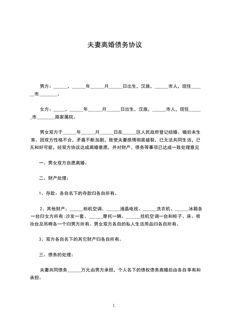 男女双方于______年______月______日在______区人民政府登记结婚。婚后未生育。因双方性格不合,矛盾不断加剧,致使夫妻感情彻底破裂,已无法共同生活,已无和好可能,经双方协议达成离婚意愿,并对财产、债务等事项已达成一致处理意见:
