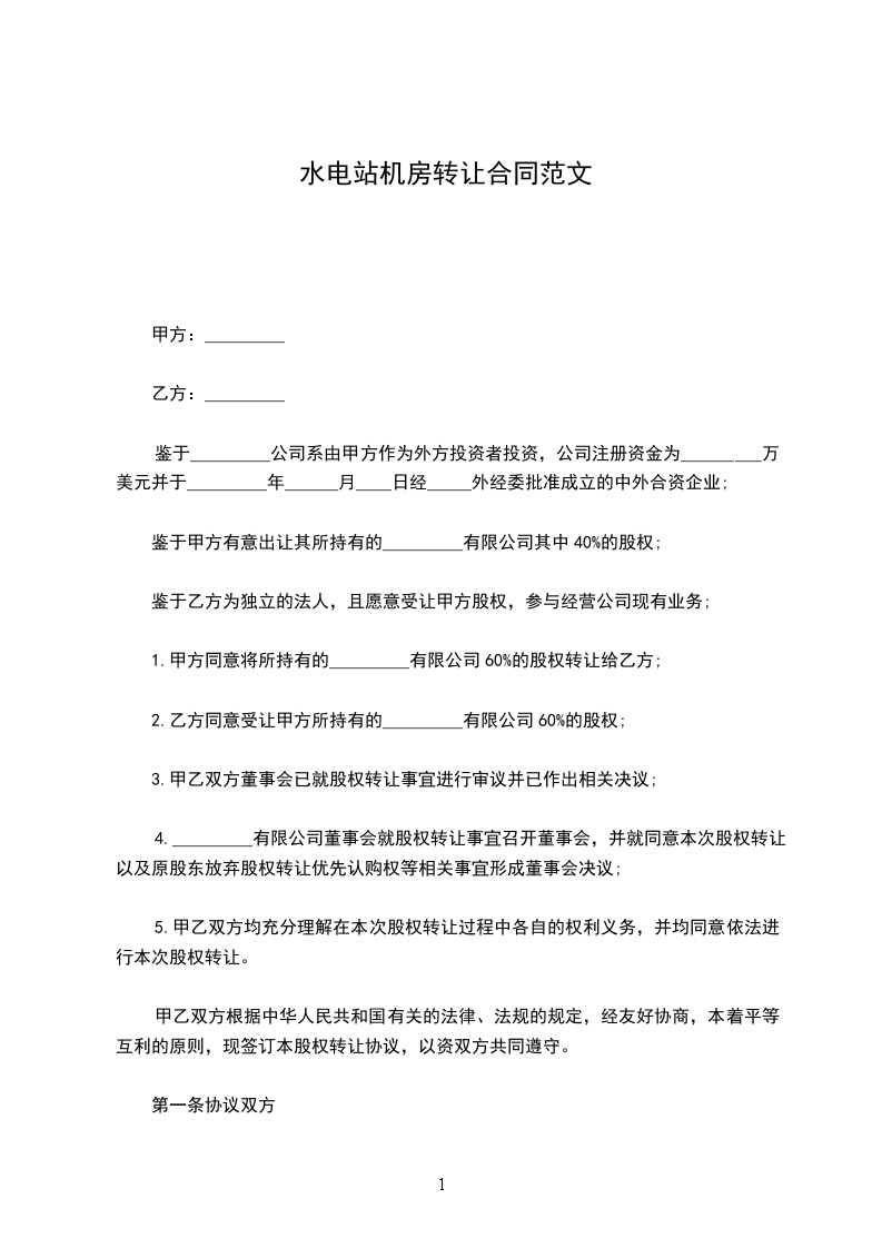1.甲方同意将所持有的_________有限公司60%的股权转让给乙方;