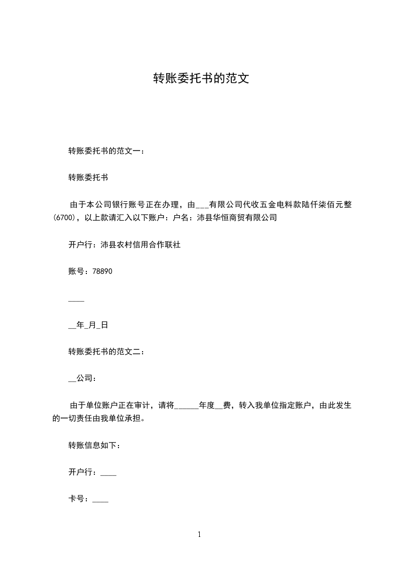 转账委托书的范文一: