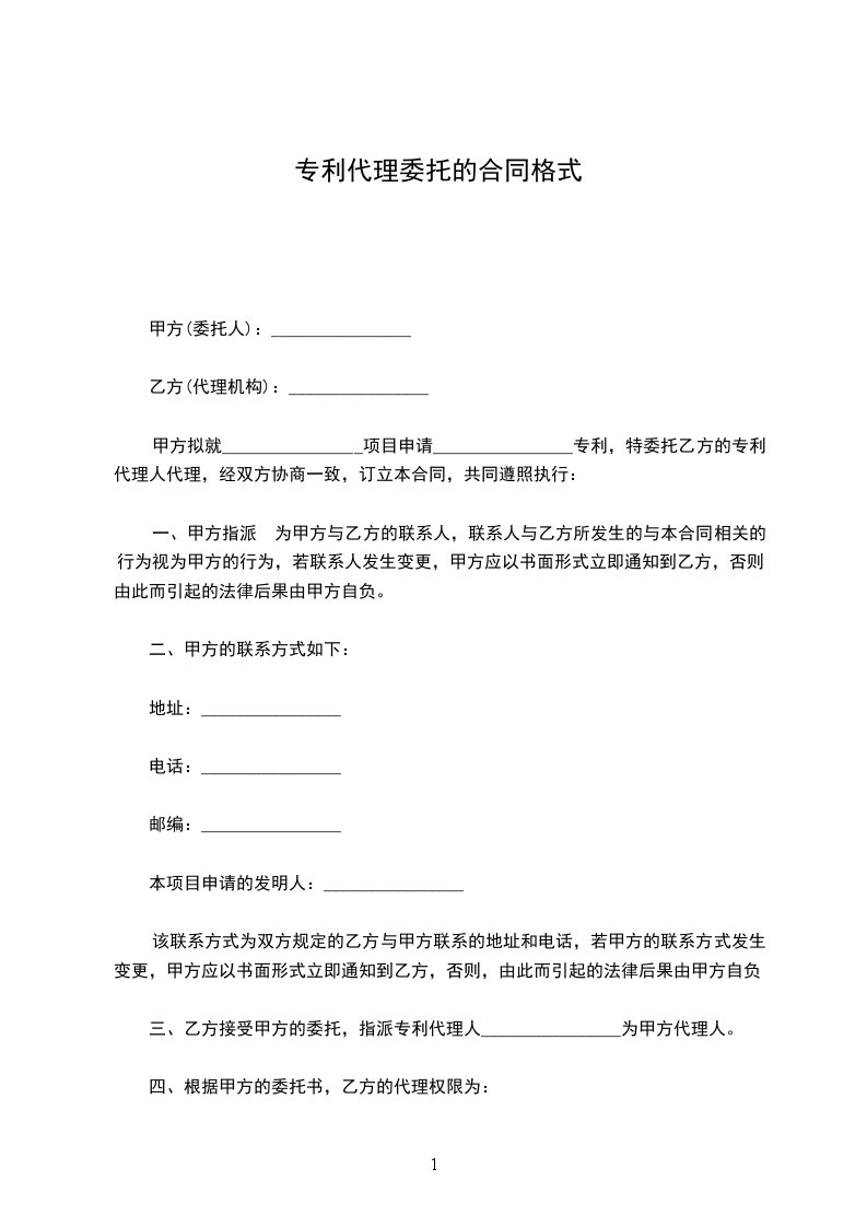 甲方拟就________________项目申请________________专利,特委托乙方的专利代理人代理,经双方协商一致,订立本合同,共同遵照执行: