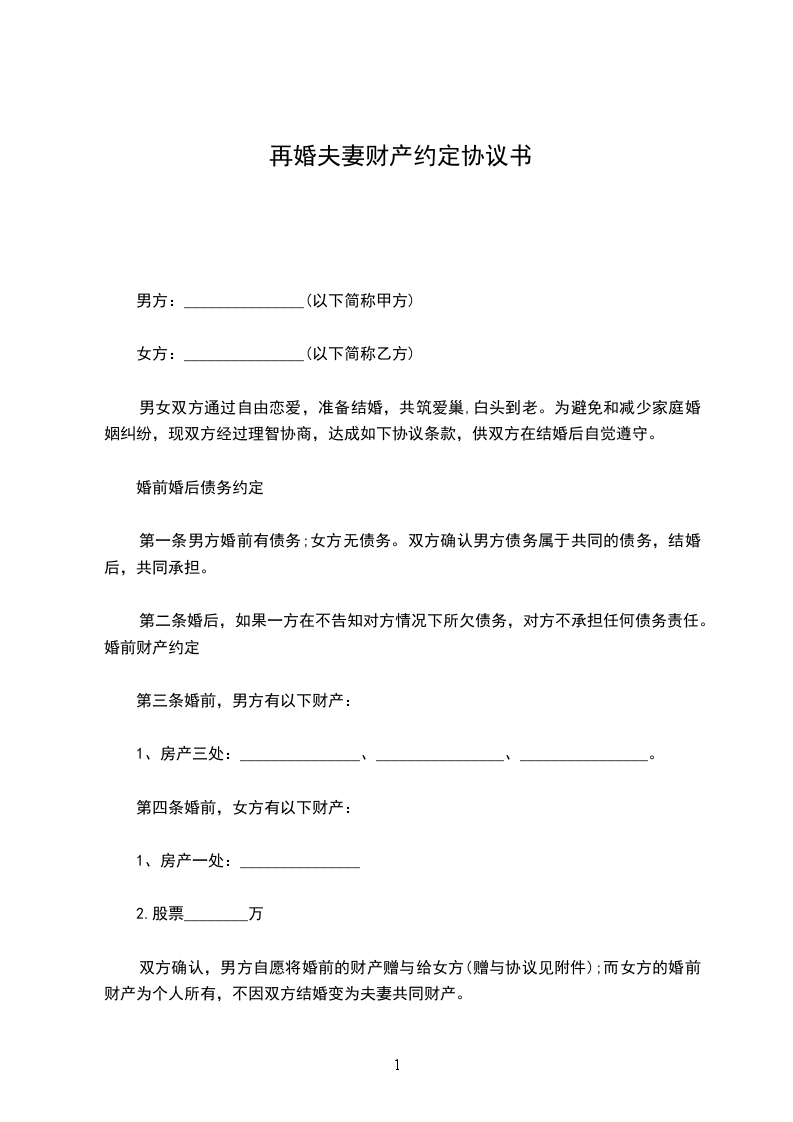 男女双方通过自由恋爱,准备结婚,共筑爱巢,白头到老。为避免和减少家庭婚姻纠纷,现双方经过理智协商,达成如下协议条款,供双方在结婚后自觉遵守。