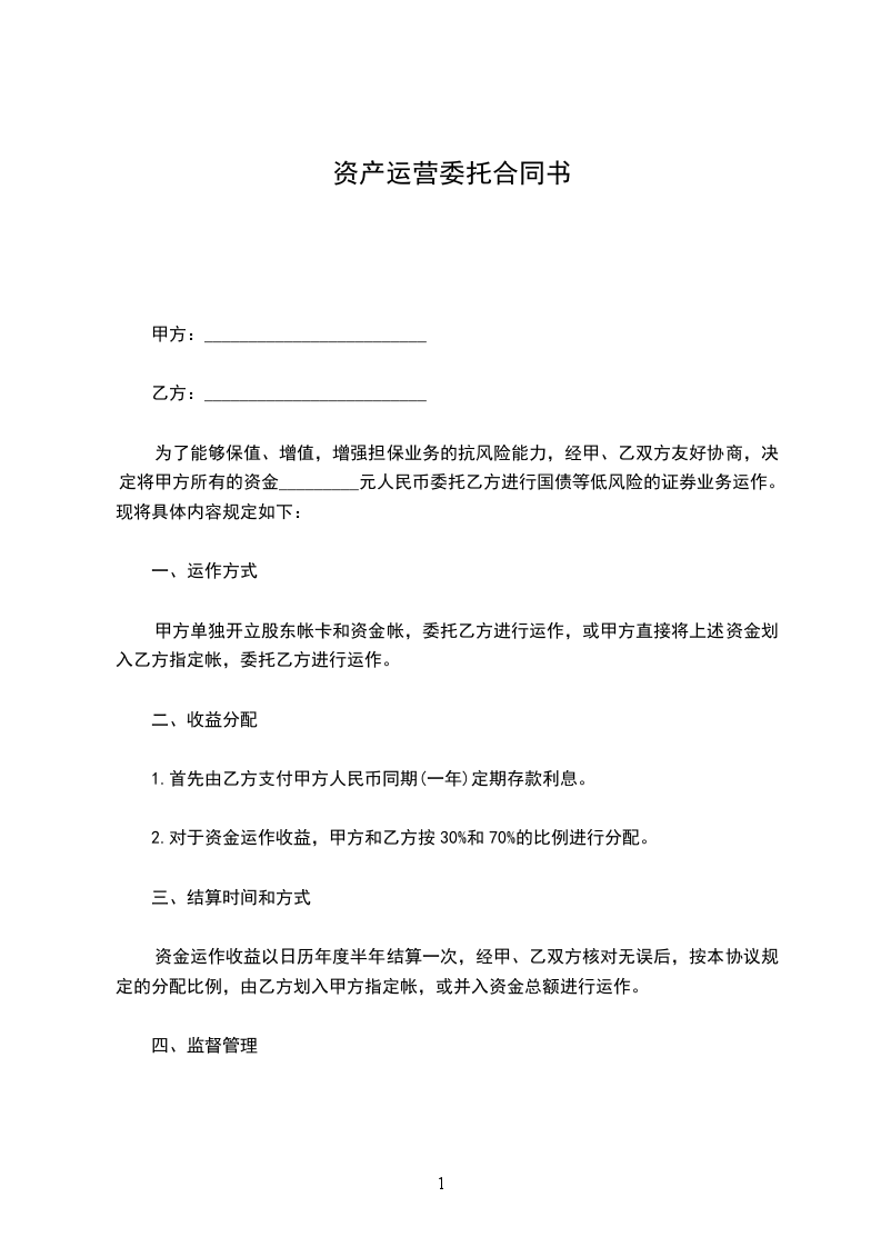 为了能够保值、增值,增强担保业务的抗风险能力,经甲、乙双方友好协商,决定将甲方所有的资金_________元人民币委托乙方进行国债等低风险的证券业务运作。现将具体内容规定如下:
