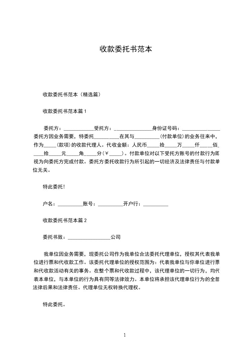 委托方:____________受托方:_______________身份证号码:_______________委托方因业务需要,特委托__________在其与__________(付款单位)的业务往来中,作为_____(款项)的收款代理人。代收金额:人民币_____拾_____万_____仟_____佰_____拾_____元_____角_____分(¥_____)。付款单位对以下受托方账号的付款行为即视为向委托方完成付款。委托方委托收款行为所引起的一切经济及法律责任与付款单位无关。
