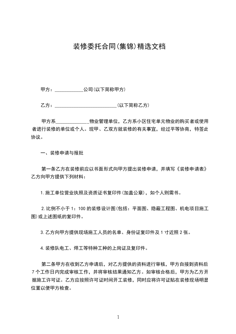 第一条乙方在装修前应以书面形式向甲方提出装修申请,并填写《装修申请表》乙方向甲方提供下列材料: