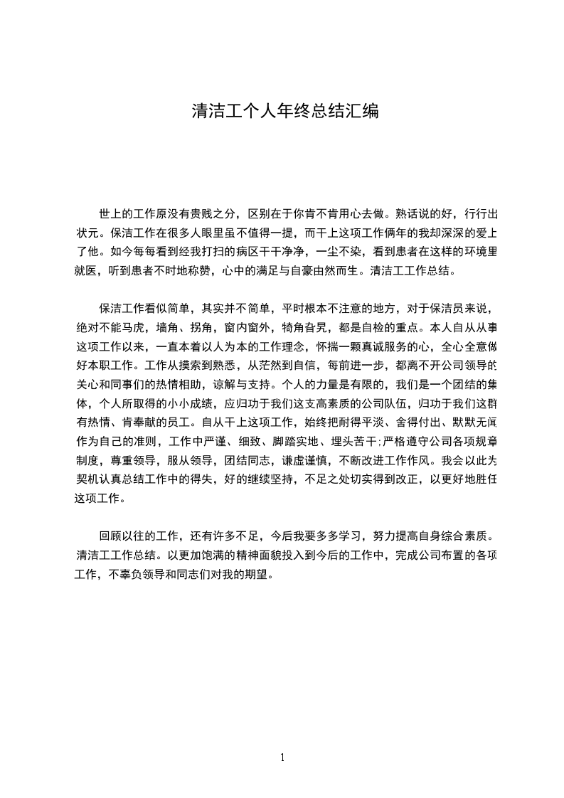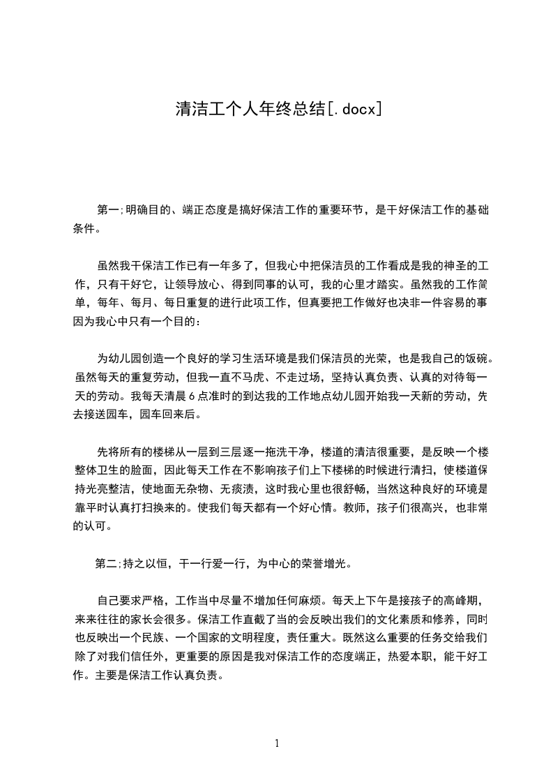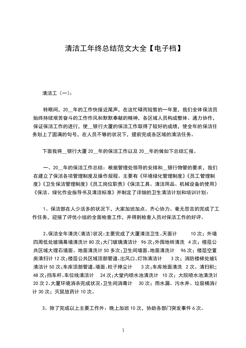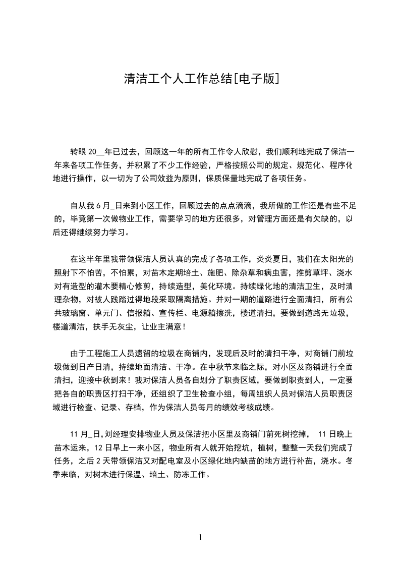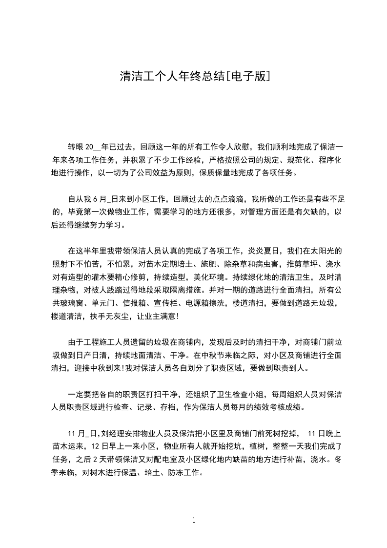 转眼20__年已过去,回顾这一年的所有工作令人欣慰,我们顺利地完成了保洁一年来各项工作任务,并积累了不少工作经验,严格按照公司的规定、规范化、程序化地进行操作,以一切为了公司效益为原则,保质保量地完成了各项任务。