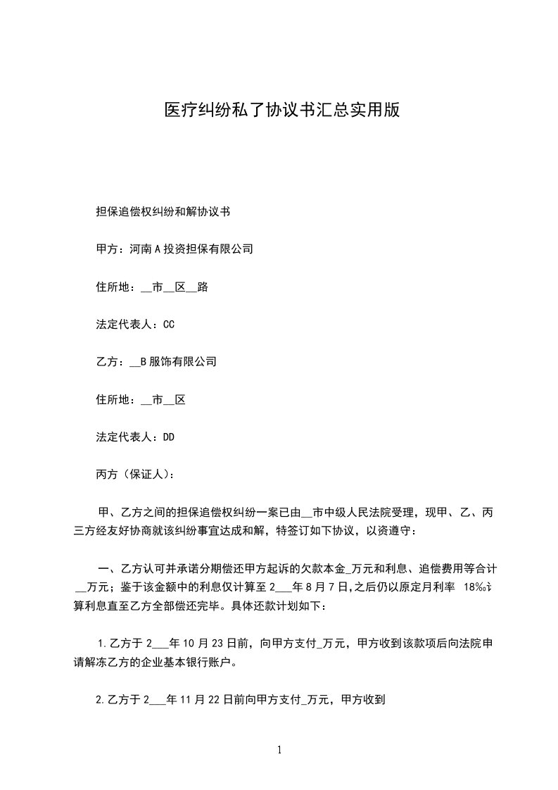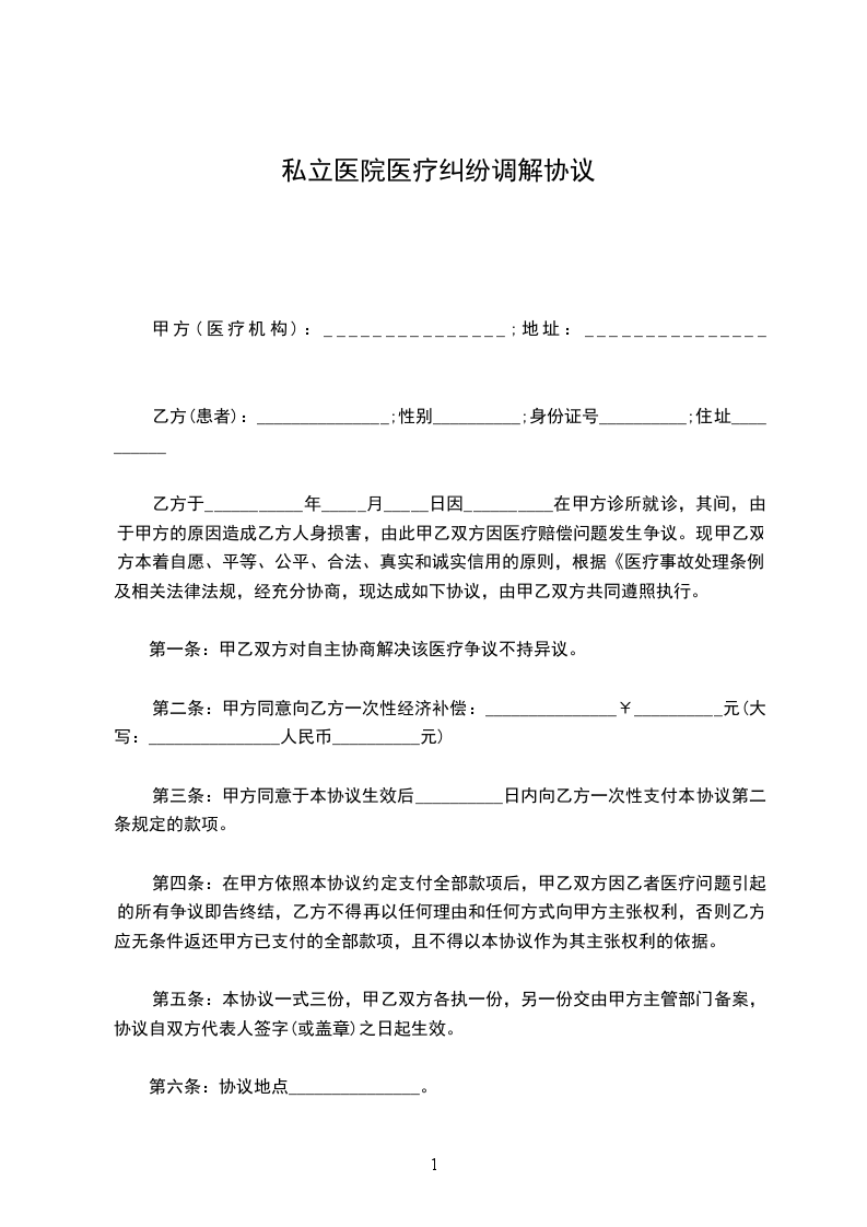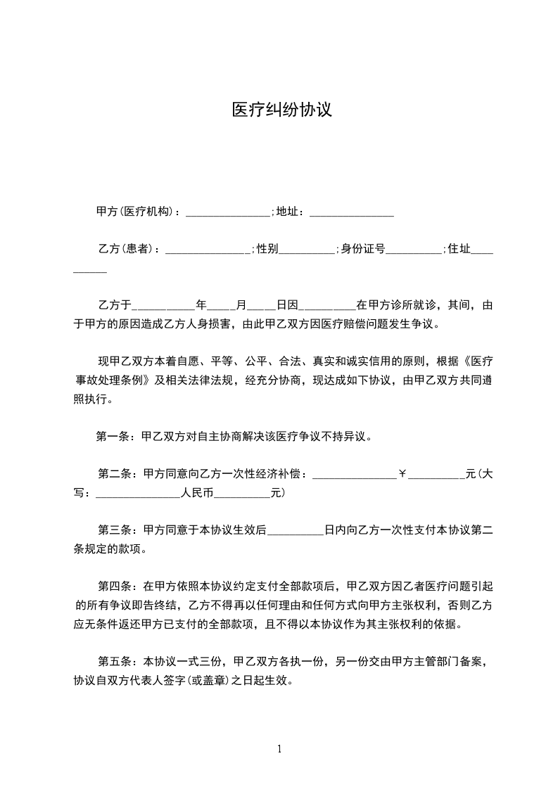 鉴于患者_____________曾于_____________年______月______日至_____________年______月______ 日在甲方处治疗, 甲、乙双方因患者医疗问题发生争议,但均愿通过协商解决; 甲、乙双方本着平等、 自愿、诚实信用的原则,根据《医疗事故处理条例》及相关法律法规,经充分协商,达成本协议如下,共同遵照执行。