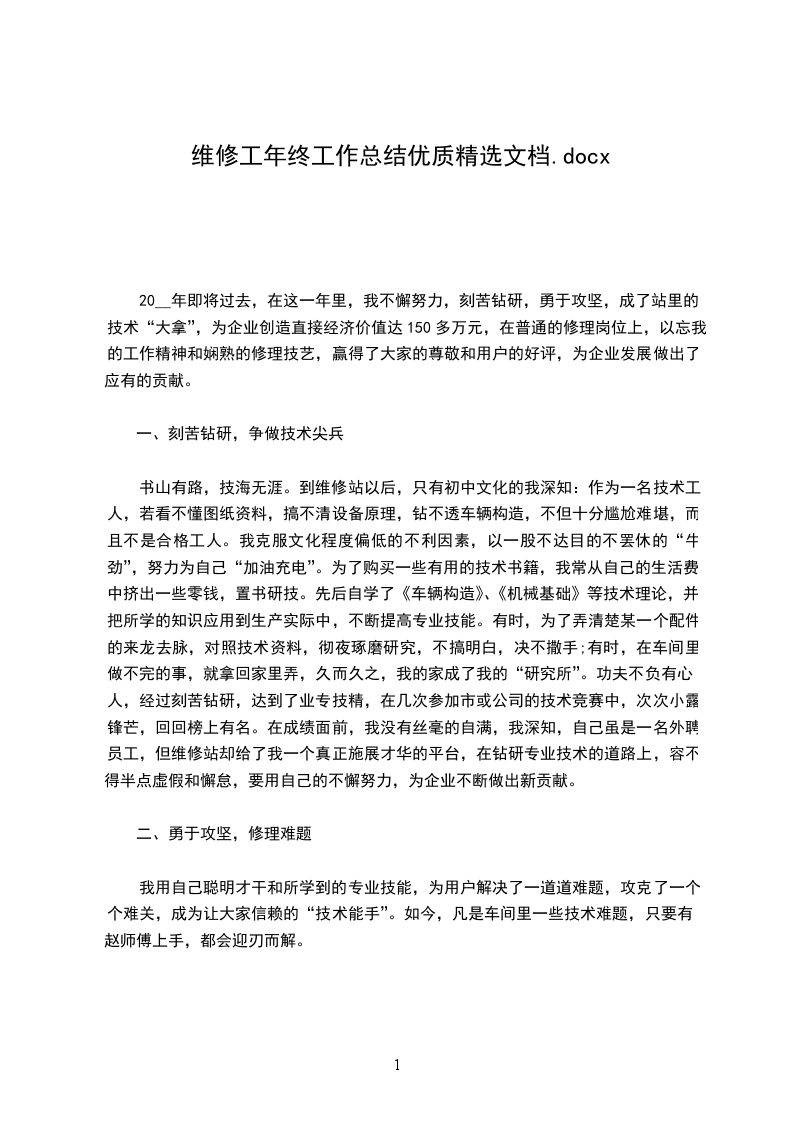 20__年即将过去,在这一年里,我不懈努力,刻苦钻研,勇于攻坚,成了站里的技术“大拿”,为企业创造直接经济价值达150多万元,在普通的修理岗位上,以忘我的工作精神和娴熟的修理技艺,赢得了大家的尊敬和用户的好评,为企业发展做出了应有的贡献。