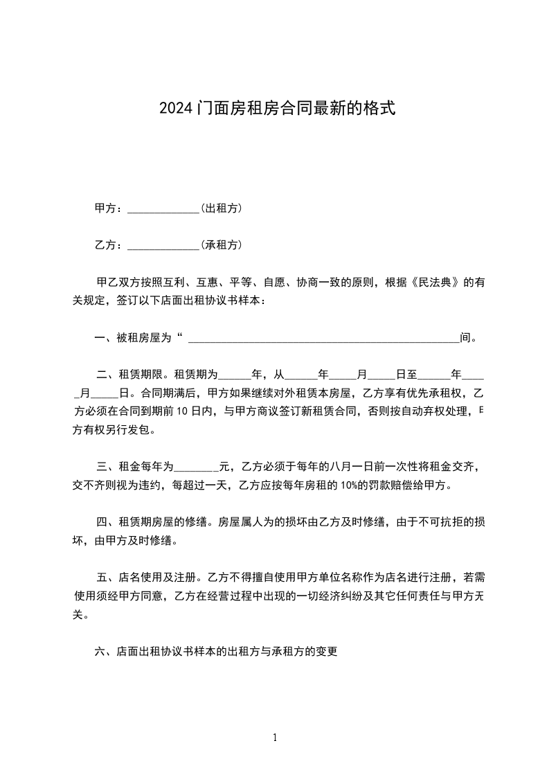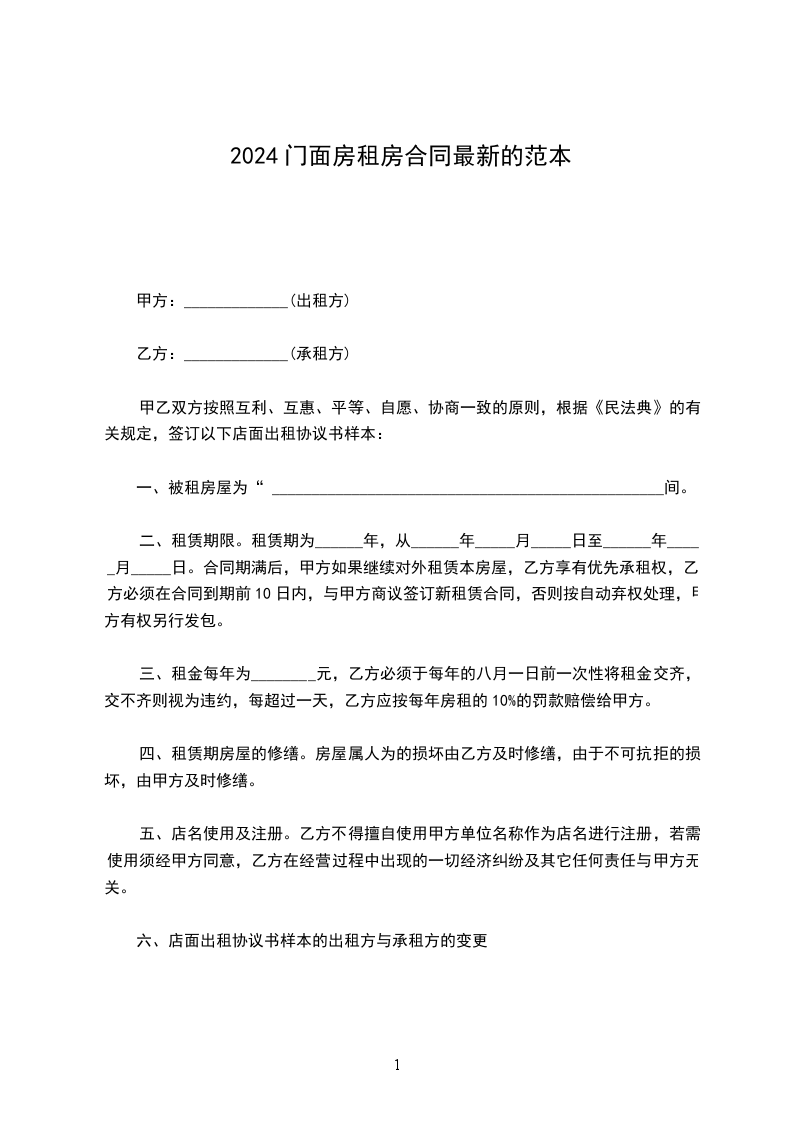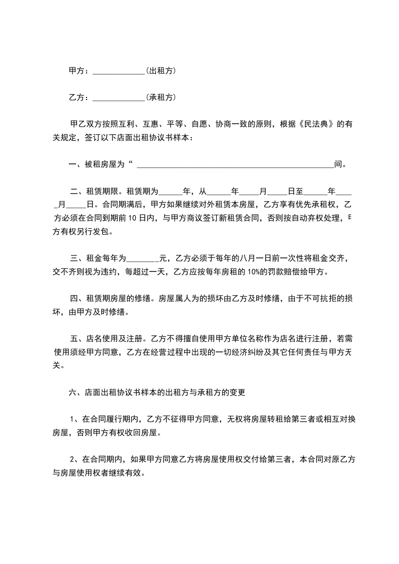 甲乙双方按照互利、互惠、平等、自愿、协商一致的原则,根据《民法典》的有关规定,签订以下店面出租协议书样本: