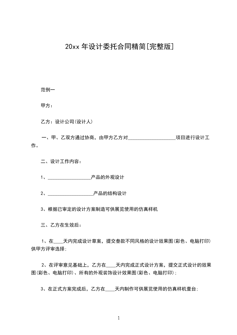 1、每款手袋的设计费用为 人民币元,(大写:整),自本合同签订之日起两年内甲乙双方不得对该设计费用的金额作任何调整。