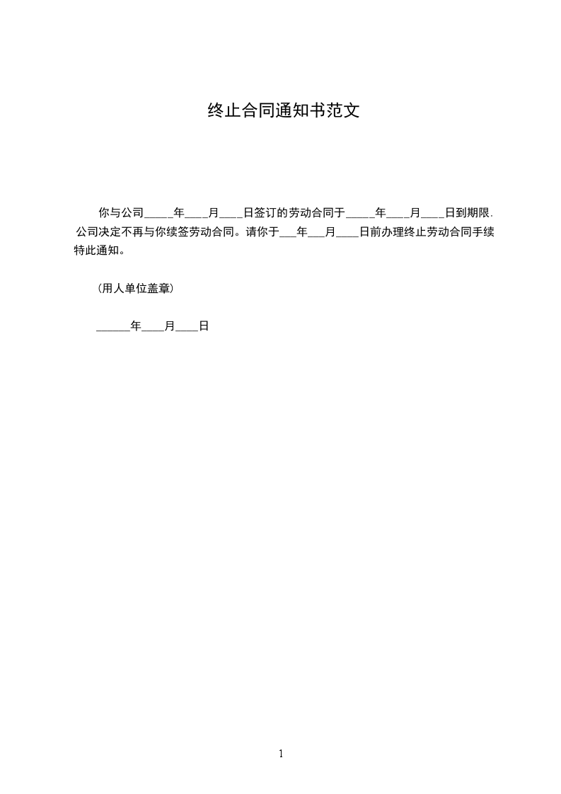 你与公司_____年____月____日签订的劳动合同于_____年____月____日到期限.公司决定不再与你续签劳动合同。请你于___年___月____日前办理终止劳动合同手续。特此通知。