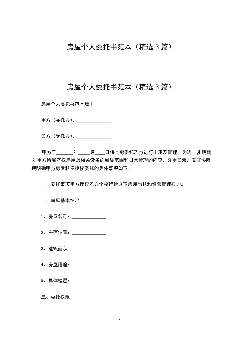 房屋个人委托书范本(精选3篇)