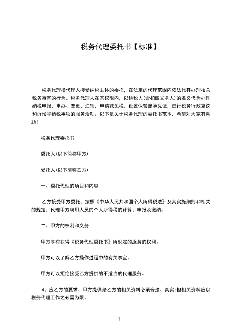 5、本《税务代理委托书》一式两份,甲乙双方各执一份,具有同等法律效力。