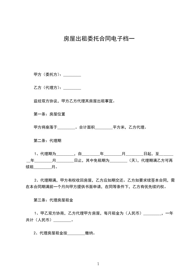 1、甲乙双方协商,乙方代理甲方房屋,每月租金为(人民币)_________,一年共计(人民币)_________。