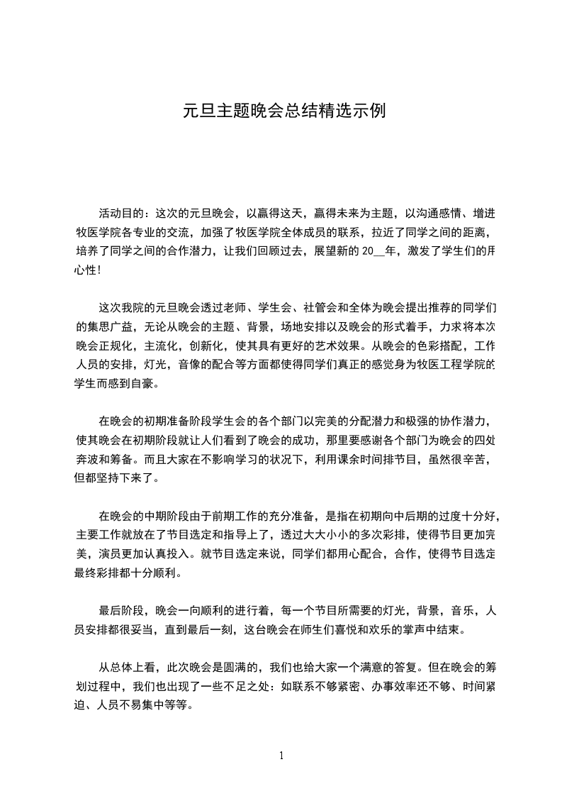 这次元旦晚会演出精彩倍至,高潮迭起,不但为我们师生们提前带来了新年的喜庆,而且还活跃了校园气氛,丰富了学生们的课余生活,为老师和同学们带给了一个展现自己文艺的舞台。愿牧医工程学院在未来的日子里更加繁荣,愿河南农业大学的前景更辉煌!