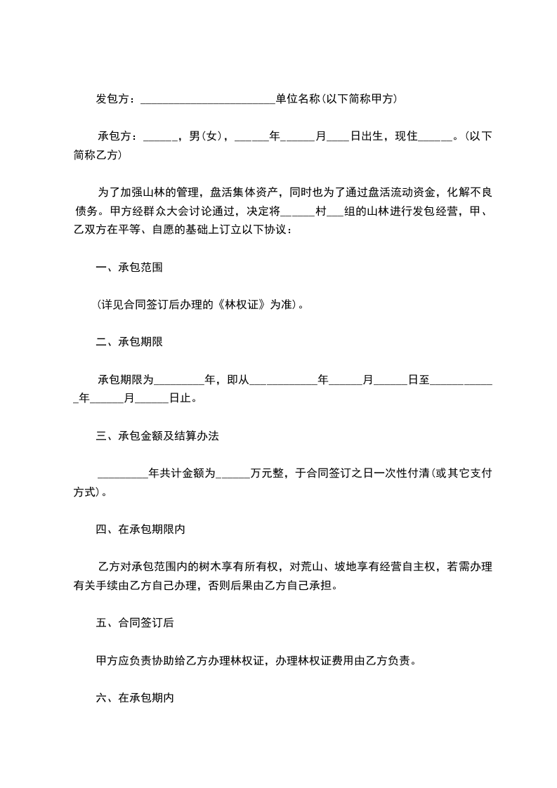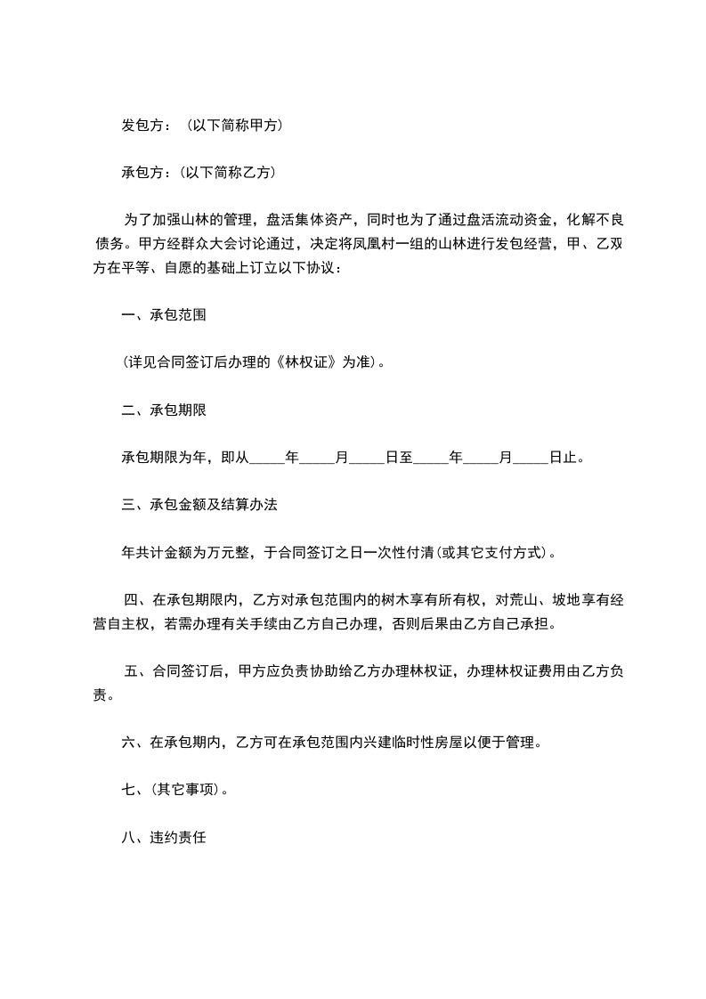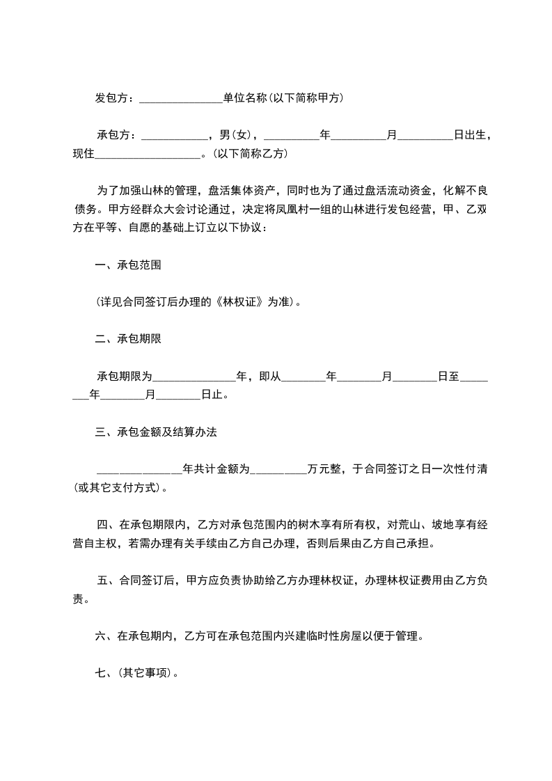 为了加强山林的管理,盘活集体资产,同时也为了通过盘活流动资金,化解不良债务。甲方经群众大会讨论通过,决定将凤凰村一组的山林进行发包经营,甲、乙双方在平等、自愿的基础上订立以下协议: