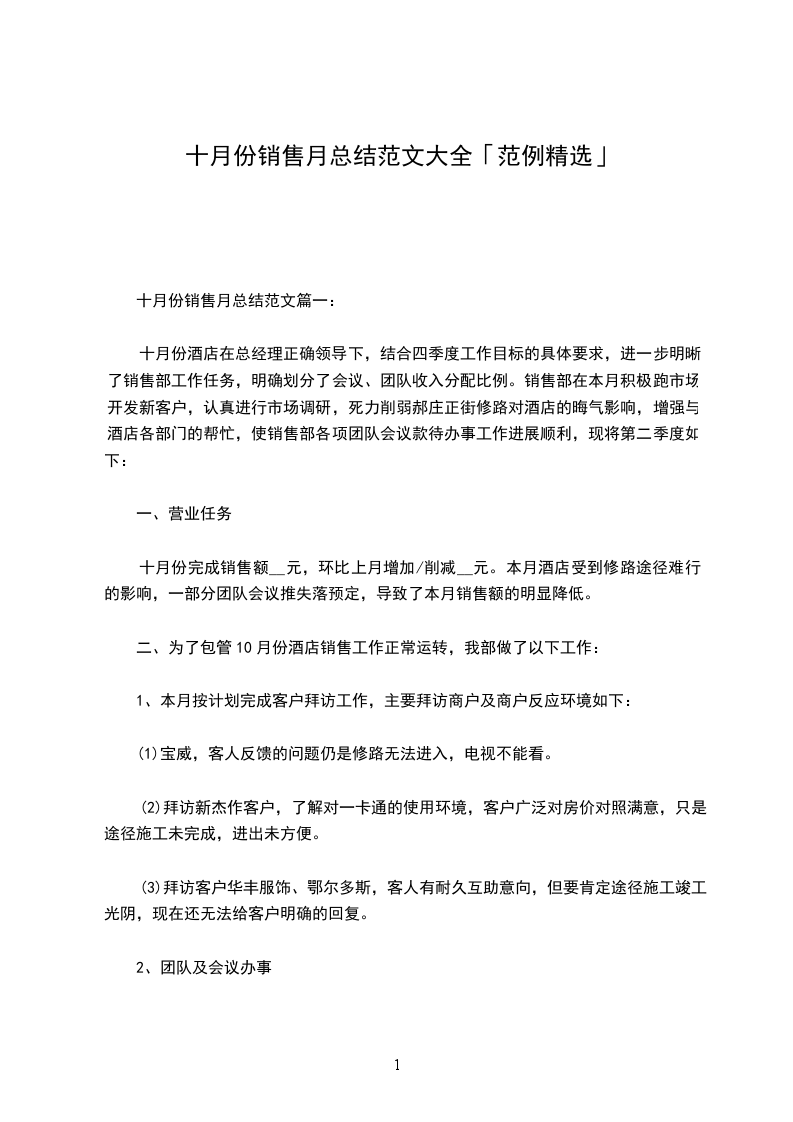 十月份完成销售额__元,环比上月增加/削减__元。本月酒店受到修路途径难行的影响,一部分团队会议推失落预定,导致了本月销售额的明显降低。