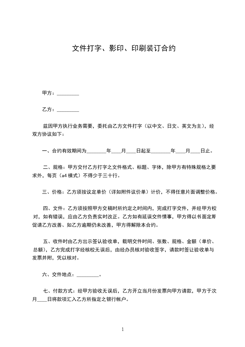 二、规格:甲方交付乙方打字之文件格式、标题、字体,除甲方有特殊规格之要求外,每页(a4横式)不得少于三十行。