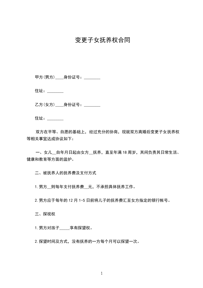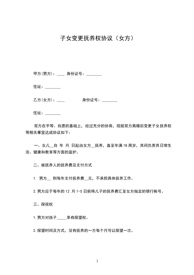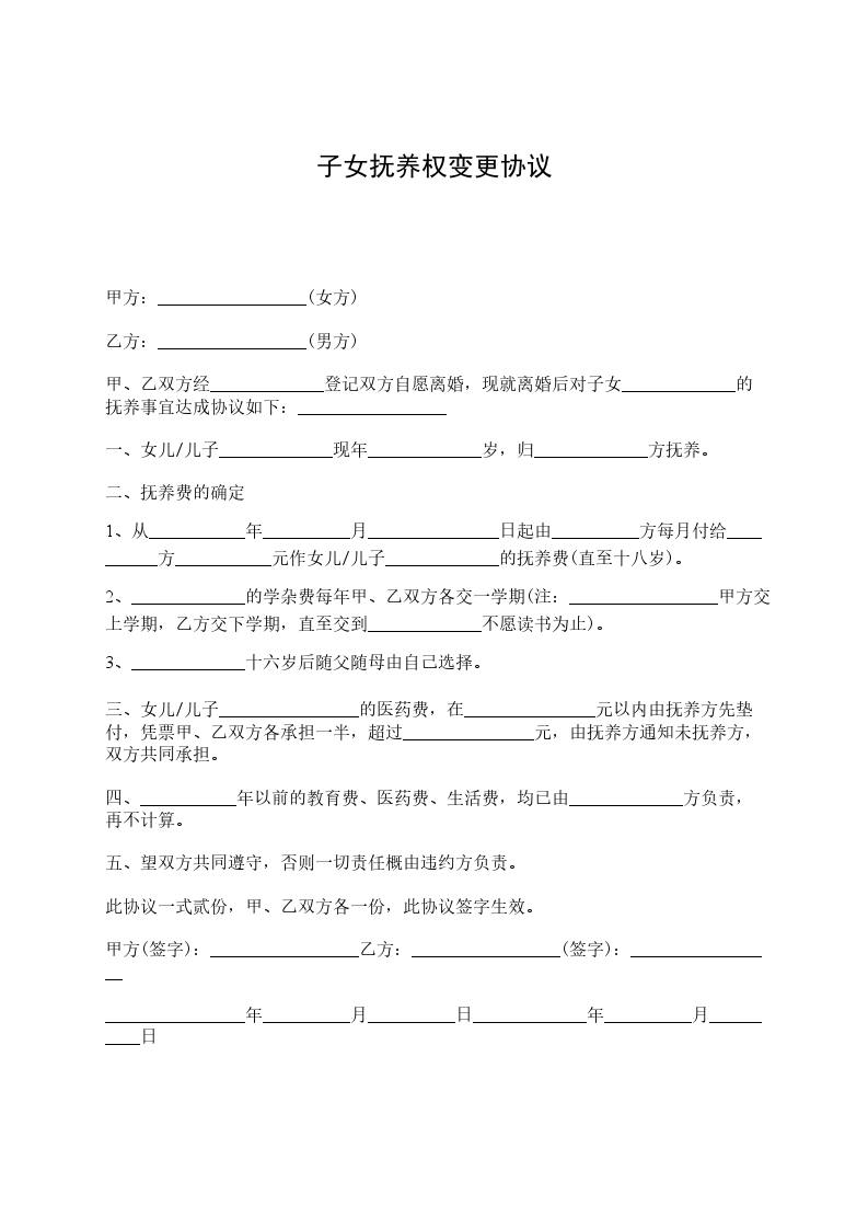 甲乙双方在平等、自愿的基础上,经过充分的协商,现就双方离婚后变更子女抚养权等相关事宜达成如下协议:
