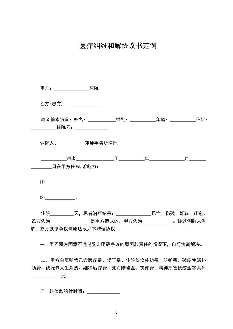 住院__________天,患者治疗结果:_______________死亡、伤残、好转、痊愈。乙方认为_________________是甲方造成的。甲方认为_____________。经过调解人调解,双方就该争议自愿达成如下赔偿协议: