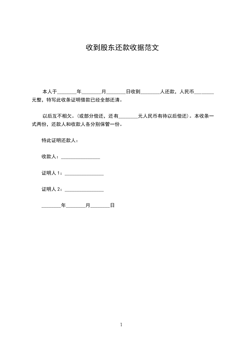 以后互不相欠。(或部分偿还,还有________元人民币有待以后偿还)。本收条一式两份,还款人和收款人各分别保管一份。
