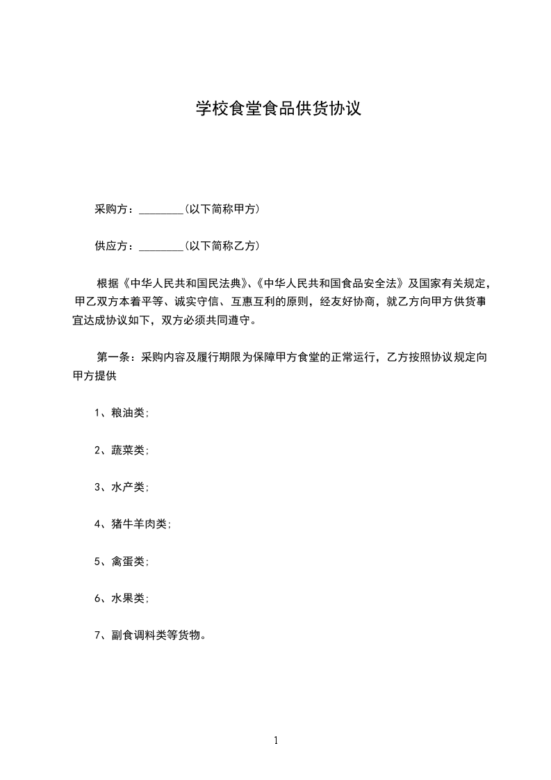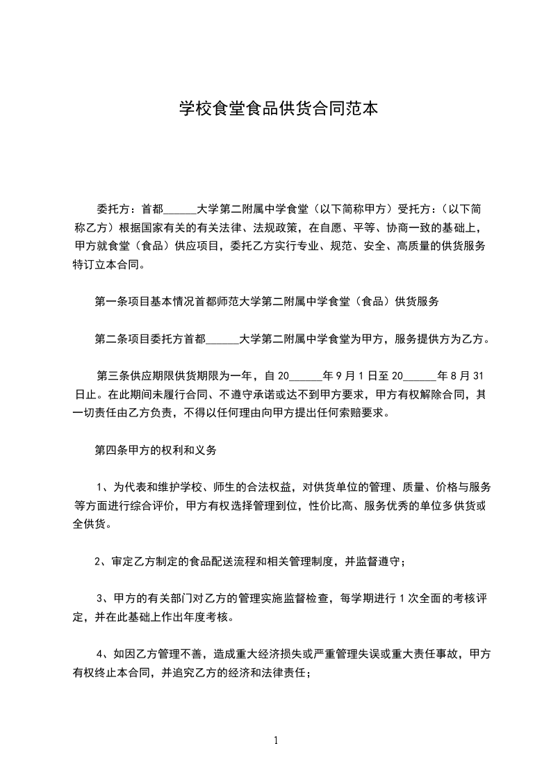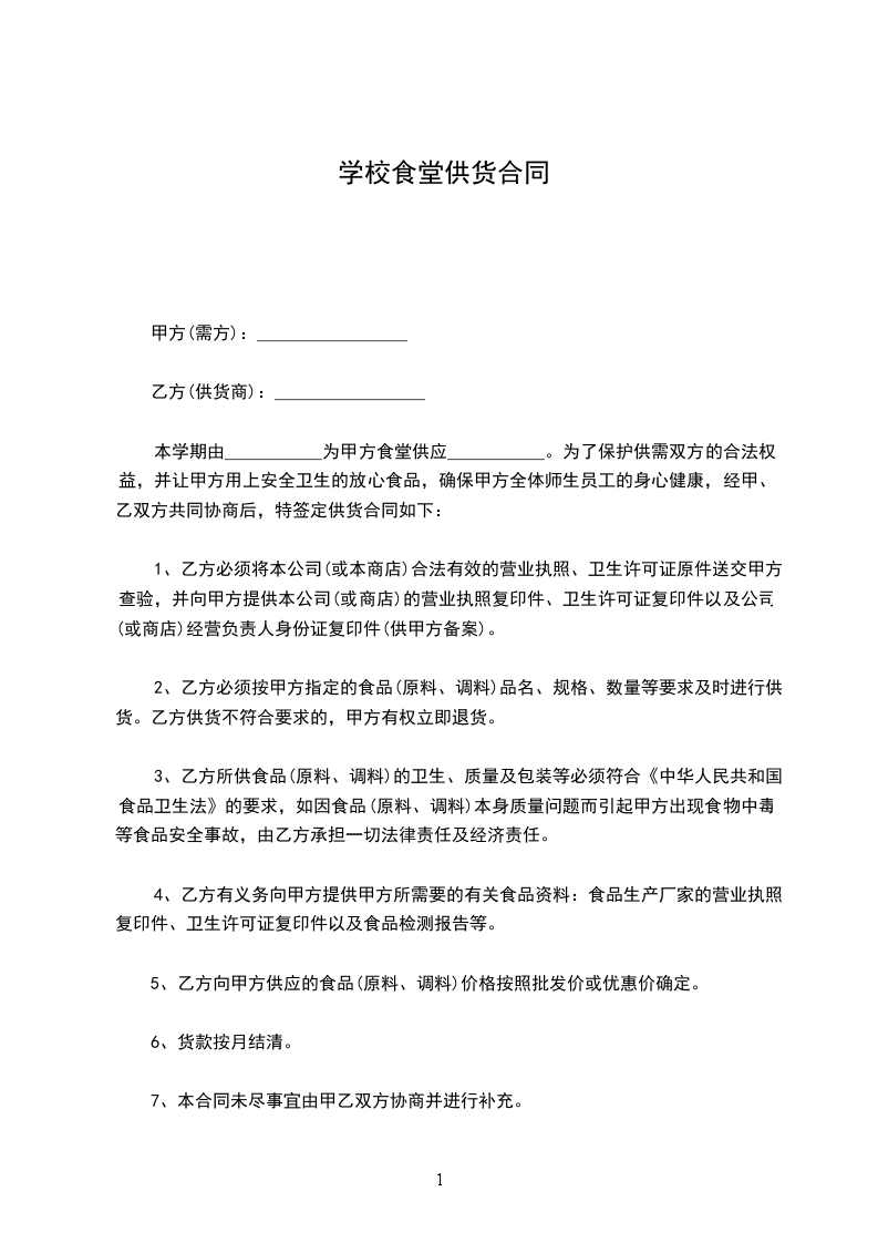 本学期由___________为甲方食堂供应___________。为了保护供需双方的合法权益,并让甲方用上安全卫生的放心食品,确保甲方全体师生员工的身心健康,经甲、乙双方共同协商后,特签定供货合同如下: