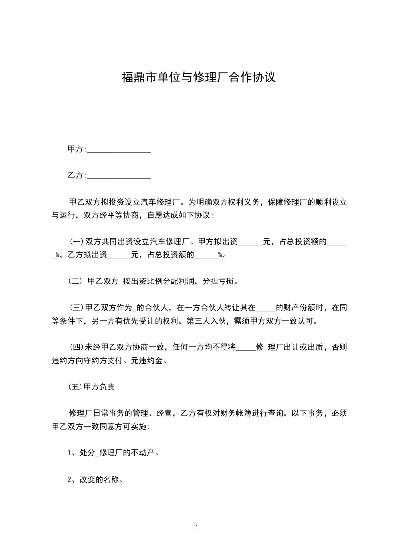 甲乙双方拟投资设立汽车修理厂。为明确双方权利义务,保障修理厂的顺利设立与运行,双方经平等协商,自愿达成如下协议: