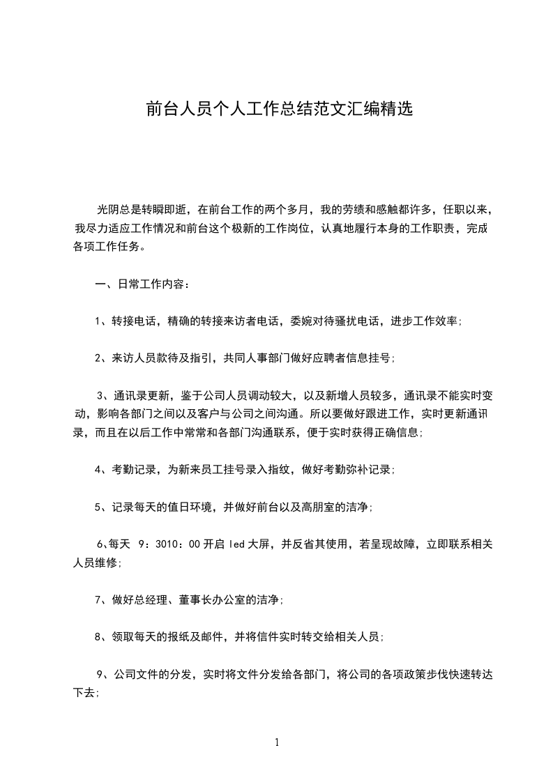 光阴总是转瞬即逝,在前台工作的两个多月,我的劳绩和感触都许多,任职以来,我尽力适应工作情况和前台这个极新的工作岗位,认真地履行本身的工作职责,完成各项工作任务。