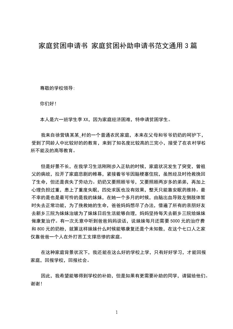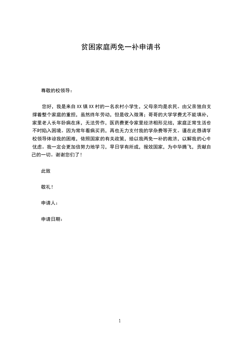 您好,我是来自XX镇XX村的一名农村小学生,父母亲均是农民。由父亲独自支撑着整个家庭的重担,虽然终年劳动,但是收入微薄;哥哥的大学学费尤不能填补,家里老人长年卧病在床,无法劳作,医药费更令家里经济相形见绌,家庭正常生活也不时陷入困境。因为常年看病买药,再也无力支付我的学杂费等开支。谨在此恳请学校领导体谅我的困难,依照国家的有关政策,给以我两免一补的救济,以解我的心中忧虑。我一定会更加倍努力地学习,早日学有所成,报效国家,为中华腾飞,贡献自己的一切。谢谢您们了!