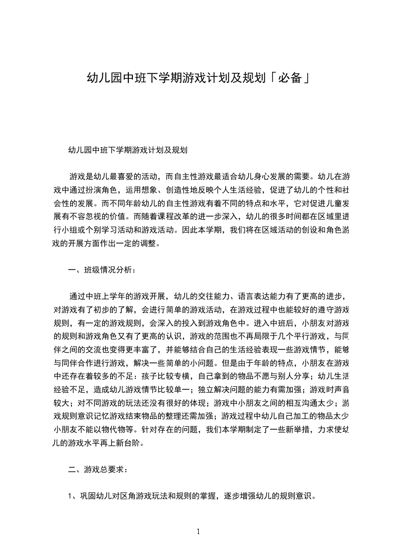 幼儿园中班下学期游戏计划及规划