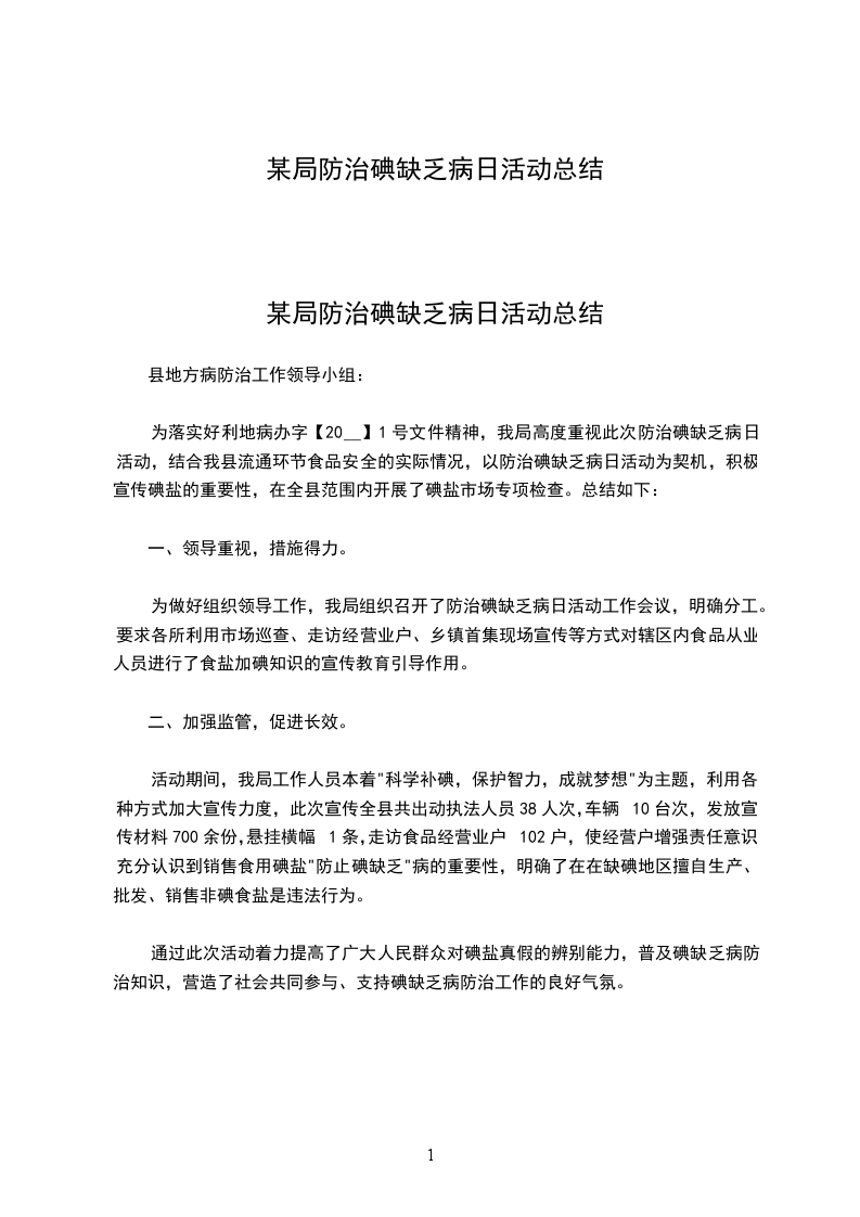 为落实好利地病办字【20__】1号文件精神,我局高度重视此次防治碘缺乏病日活动,结合我县流通环节食品安全的实际情况,以防治碘缺乏病日活动为契机,积极宣传碘盐的重要性,在全县范围内开展了碘盐市场专项检查。总结如下: