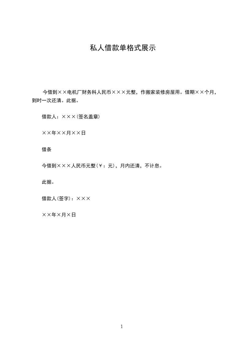 今借到××电机厂财务科人民币×××元整,作搬家装修房屋用。借期××个月,到时一次还清。此据。