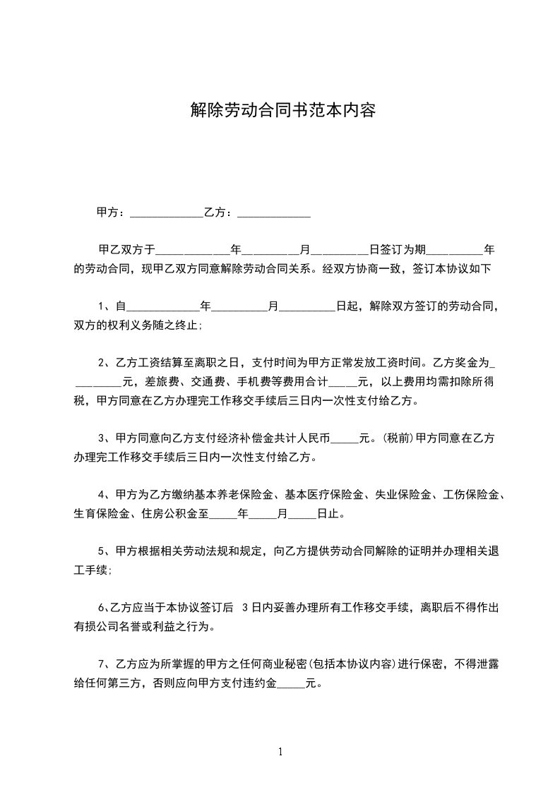 1、自_____________年__________月__________日起,解除双方签订的劳动合同,双方的权利义务随之终止;