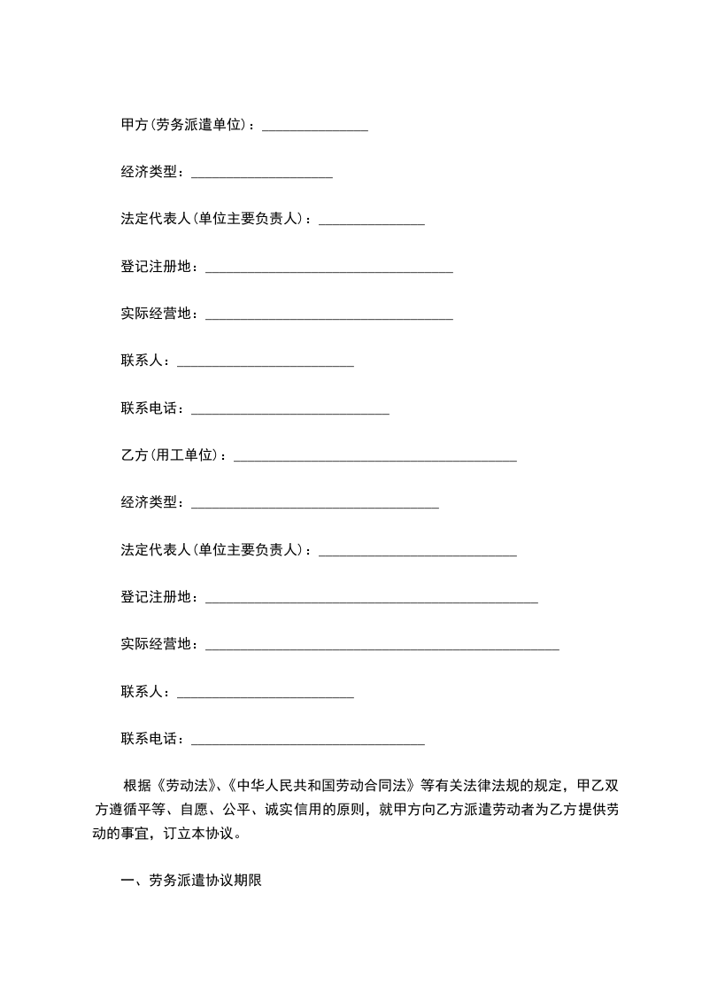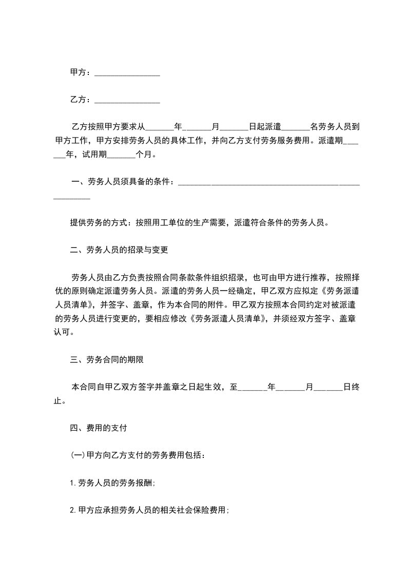 乙方按照甲方要求从_______年_______月_______日起派遣_______名劳务人员到甲方工作,甲方安排劳务人员的具体工作,并向乙方支付劳务服务费用。派遣期_______年,试用期_______个月。
