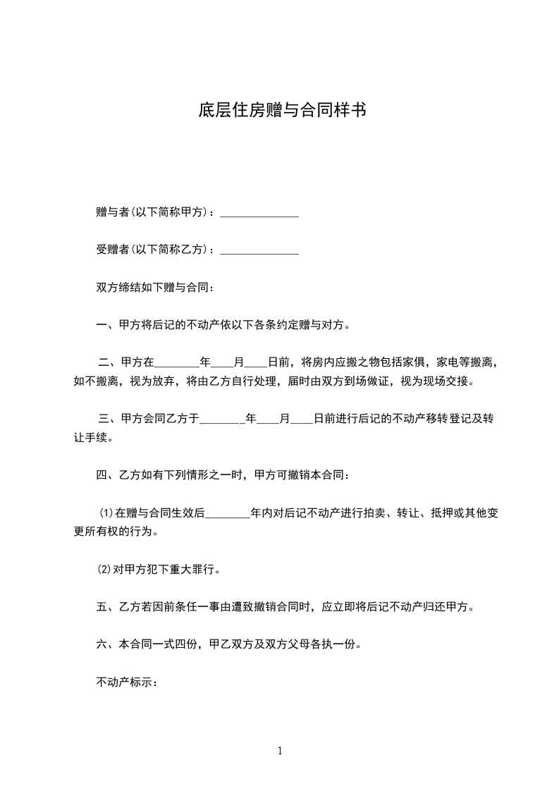 一、甲方自愿将其座落于_______________,建筑面积_______________平方米,产权证号的房屋一套赠与给乙方,乙方自愿接受该房屋。