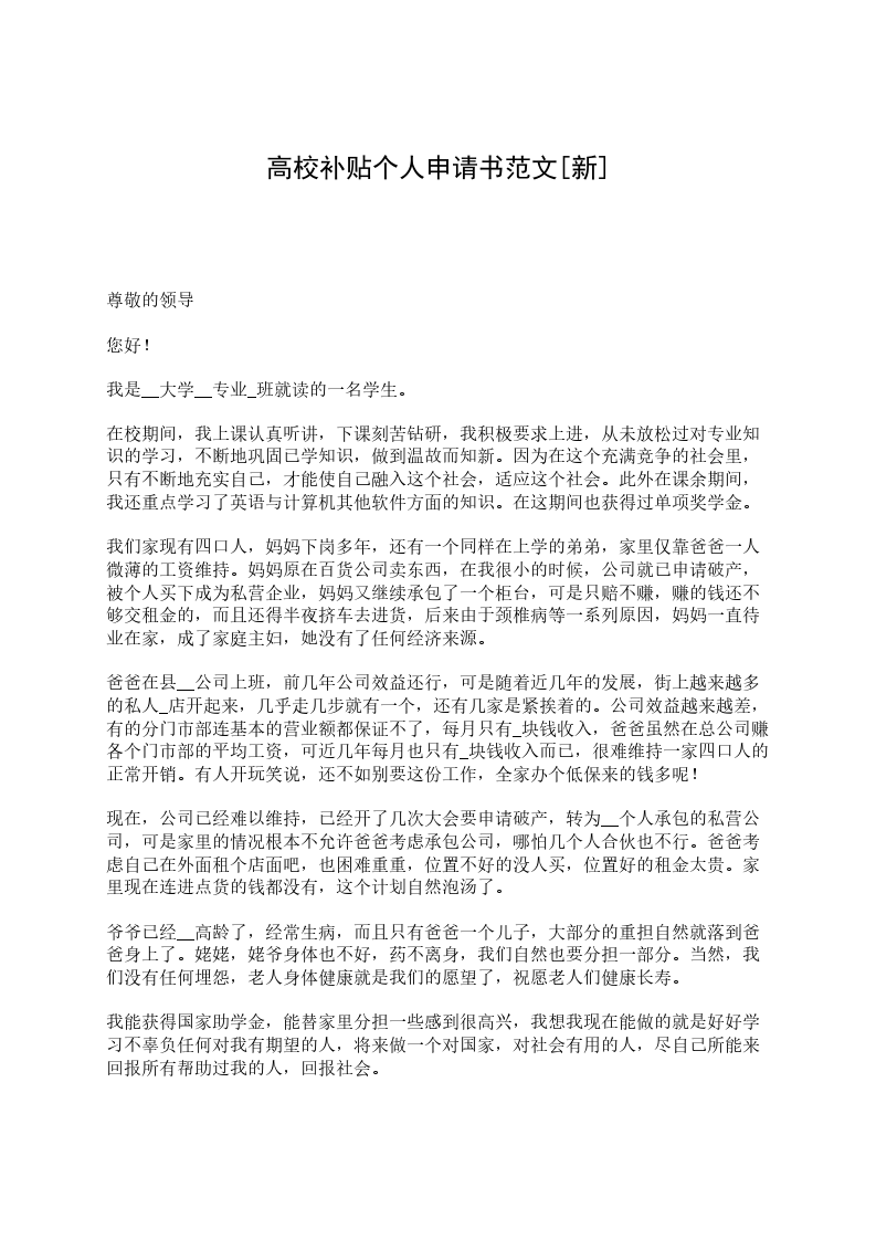 高校补贴个人申请书篇2