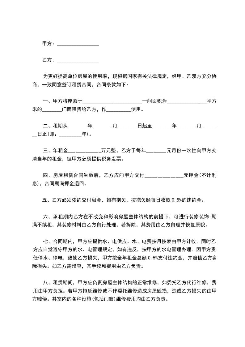 为更好提高单位房屋的使用率,现根据国家有关法律规定,经甲、乙双方充分协商,一致同意签订租赁合同,合同条款如下: